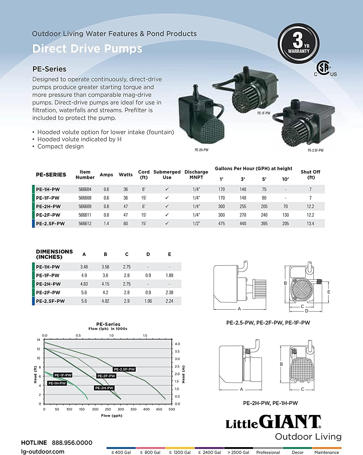 Little Giant PE-2F-PW 115 Volt, 1/40 HP, 300 GPH Submersible Direct Drive Pump for Small Ponds or Fountains with 15-Ft. Cord, Black, 566611