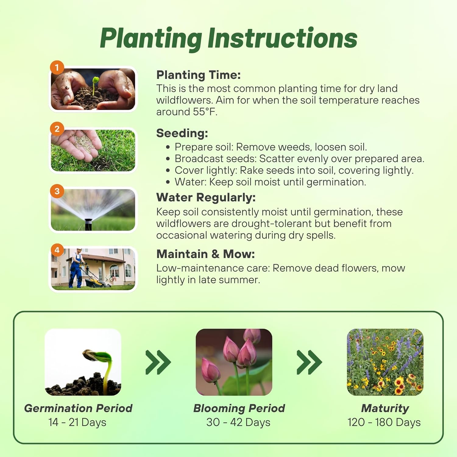 - EASY TO PLANT AND MANAGE: These drought tolerant wildflower seeds are simple to establish, whether broadcasting or drilling. Plant at a depth of ¼ inch in the spring when soil temperatures reach 55°F. Keep the soil moist until germination to achieve optimal results. It’s suitable for both full sun and shaded areas, making it versatile for various landscape settings.