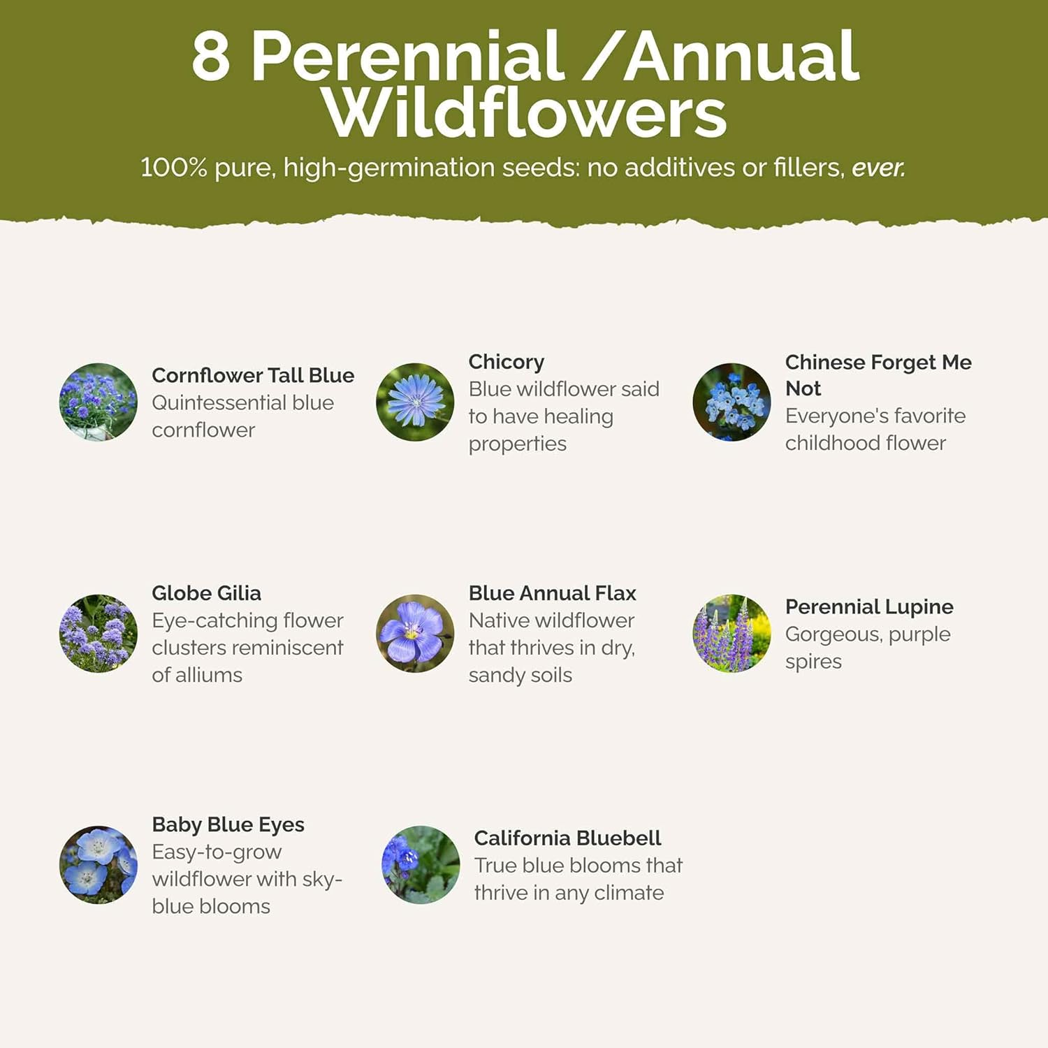 - 100% Pure, Non-GMO Seeds - No fillers, favorites only! Includes 9 easy-to-grow species: Annual Blue Flax, Wild Perennial Lupine, Baby Blue Eyes, Chicory, Cornflower Dwarf Blue, Blue Columbine, Chinese Forget Me Not, Globe Gilia, California Bluebell