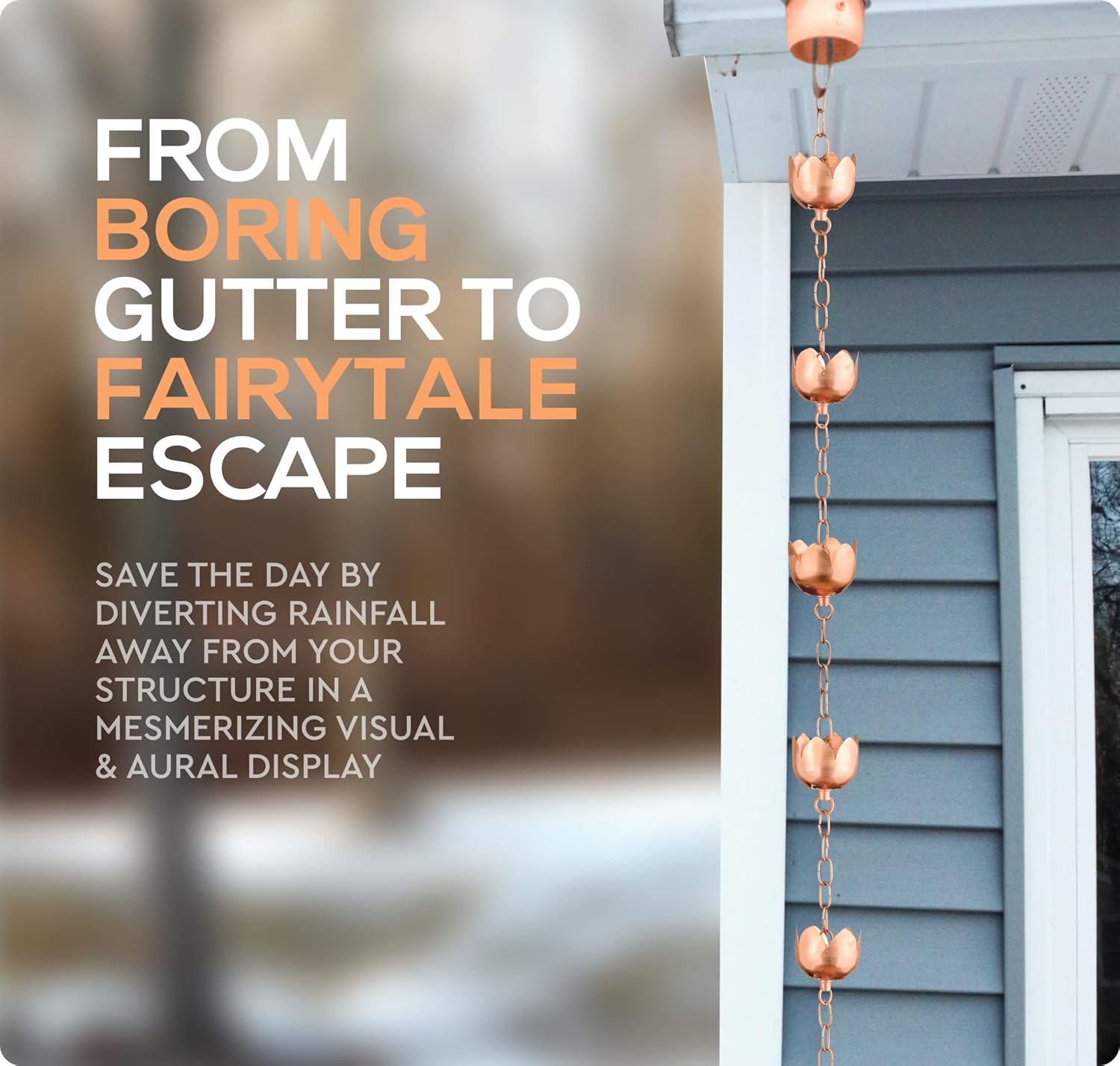 - ENCHANTING GARDEN RAIN CHAINS – Gorgeous Chimes & Cups Make a Beautiful Alternative to Ugly Downspouts – Hang From the Gutter & Watch the Water Collect & Direct Away from Your House in a Lovely Cascading Waterfall Display