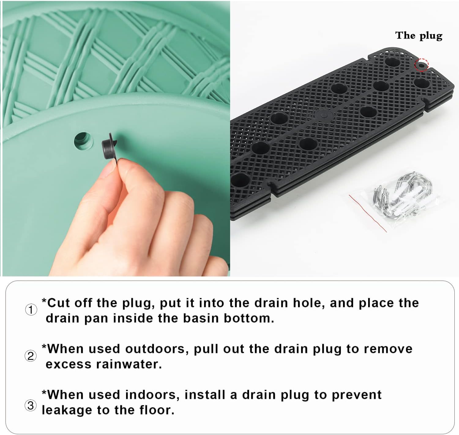 - Use instruction: Cut down the plug and put it into the drain hole,then place the drain pan at the pot bottom. Pull out drainage plug to allow for the removal of excess rainwater when installed outdoors. Install drainage plug when used indoors.