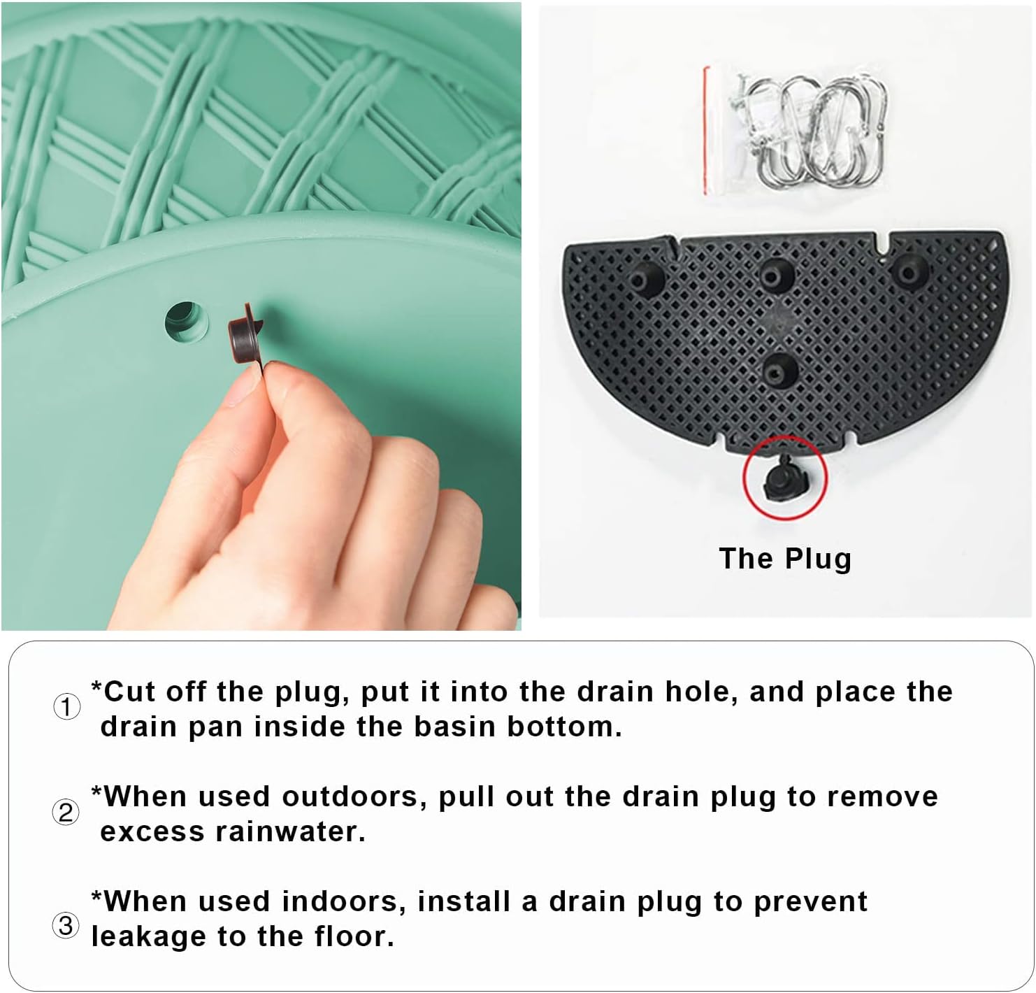 - Use instruction: Cut down the plug and put it into the drain hole,then place the drain pan at the pot bottom. Pull out drainage plug to allow for the removal of excess rainwater when installed outdoors. Install drainage plug when used indoors.