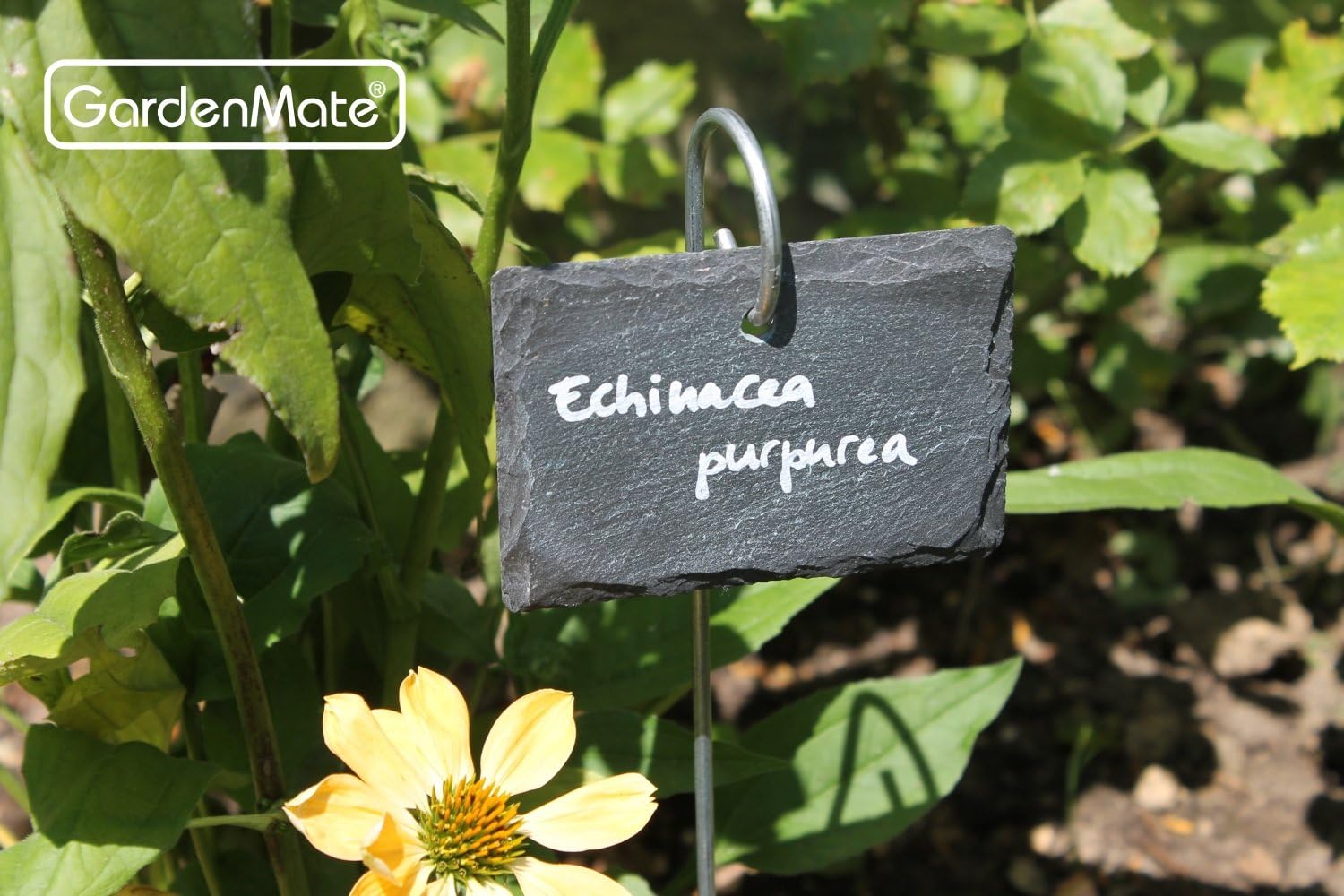 - Set of 5 slate plant labels designed to hang from the metal rods