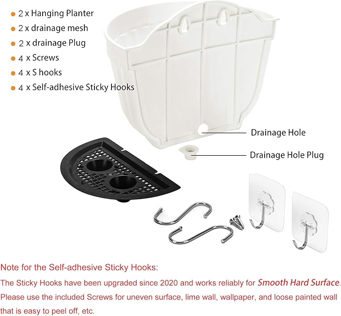 - INDOOR & OUTDOOR USE: vertical wall hanging planter made of high quality durable PP resin material, safe and non-toxic, this polypropylene resin planter is a tough, lightweight , all-weather durability with UV protection for outdoor use, an alternative to clay or ceramic planters. Pull out drainage plug to allow for the removal of excess rainwater when installed outdoors. Install drainage plug when used indoors. SIZE (L*W*H): 8.1"x4.7"x6.8"; 4 x “S” hooks of stainless steel included.