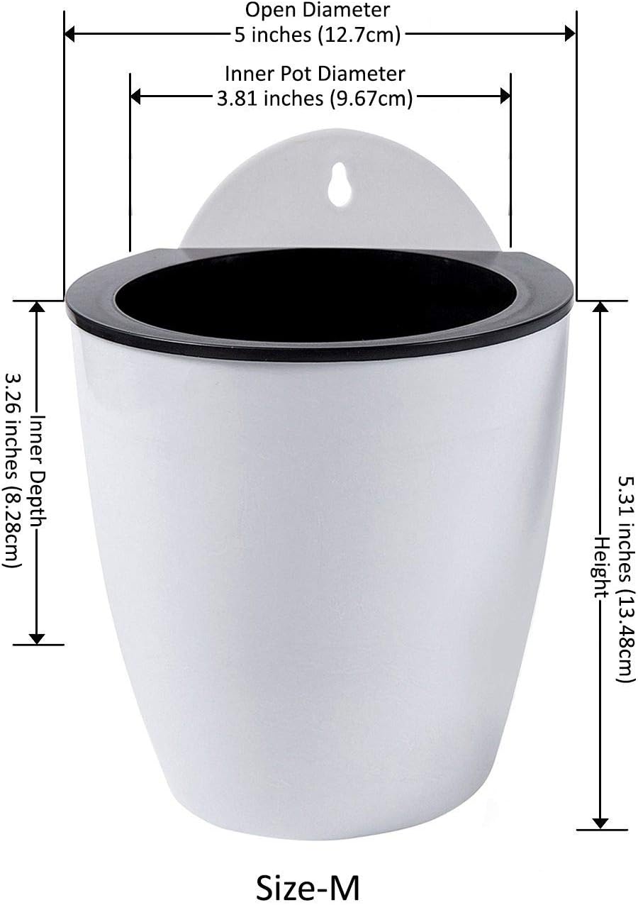 - [ Size: ] Outer Pot Diameter 5 inches and Height 5.31 inches. Inner Pot Diameter 3.82 inches and Height 3.26 inches. Top Opening for Soil and Plant has a diameter of 3 inches. Made with lightweight durable PP plastic. Great as wall pots for plants.