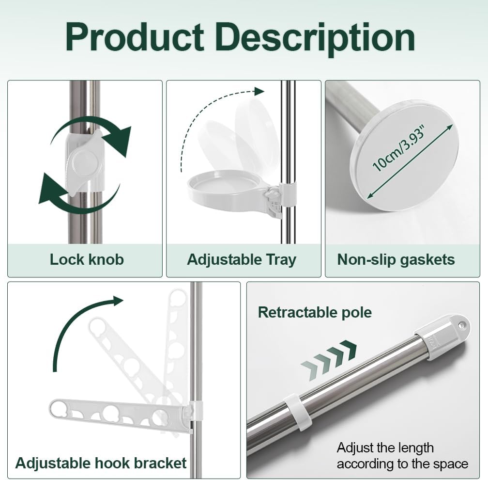 - With 2 hooks, 12 trays & 1 telescopic rod, the hooks and trays can be be stored upright or rotated 360 degrees, height adjustable, the telescopic rod for drying clothes.