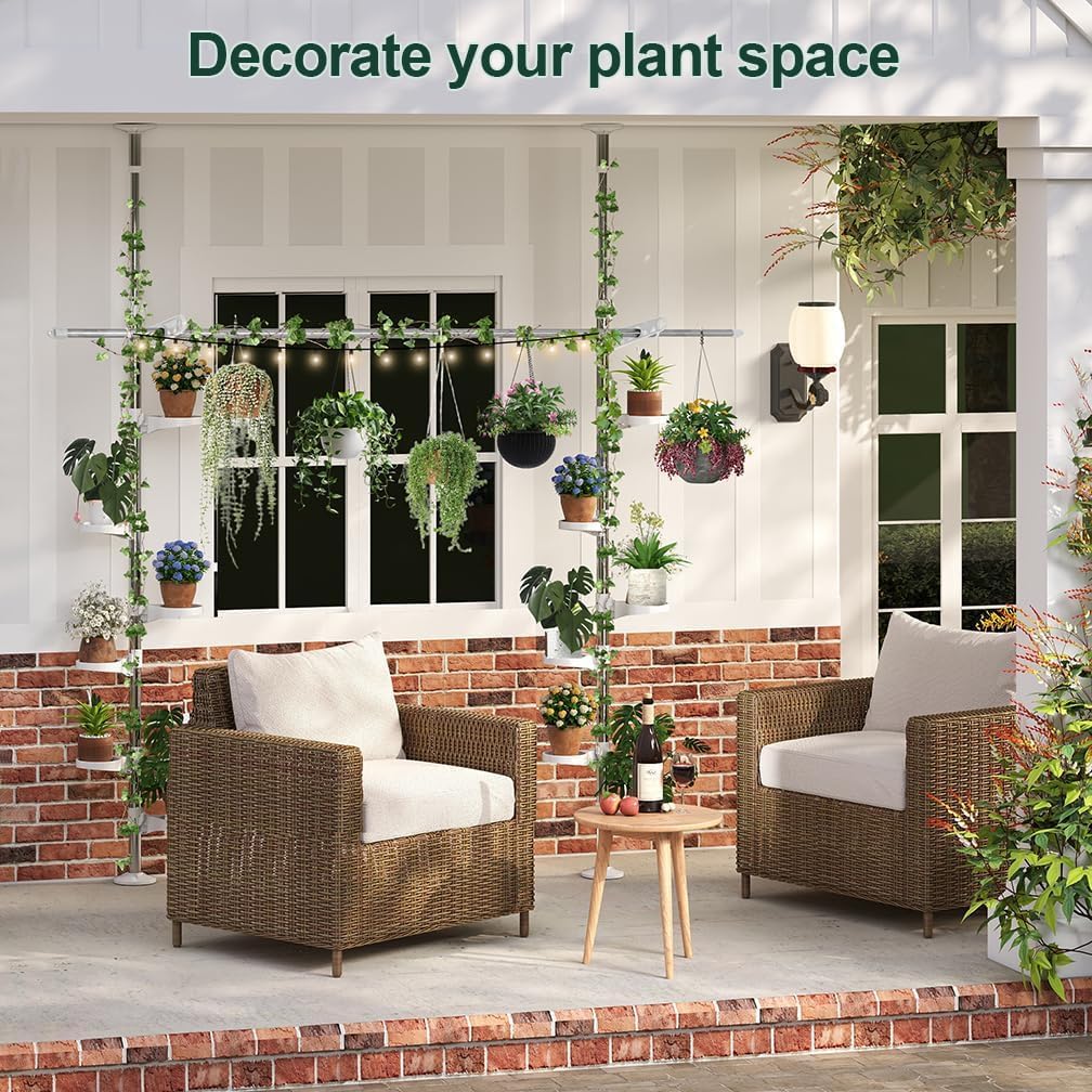 Hershii Adjustable Indoor Plant Stands Double Tension Pole Stainless Steel Flower Display Racks Holder Corner Storage Shelves with 12 Trays, 2 Hooks & 1 Telescopic Clothes Drying Hanging Rod - Ivory