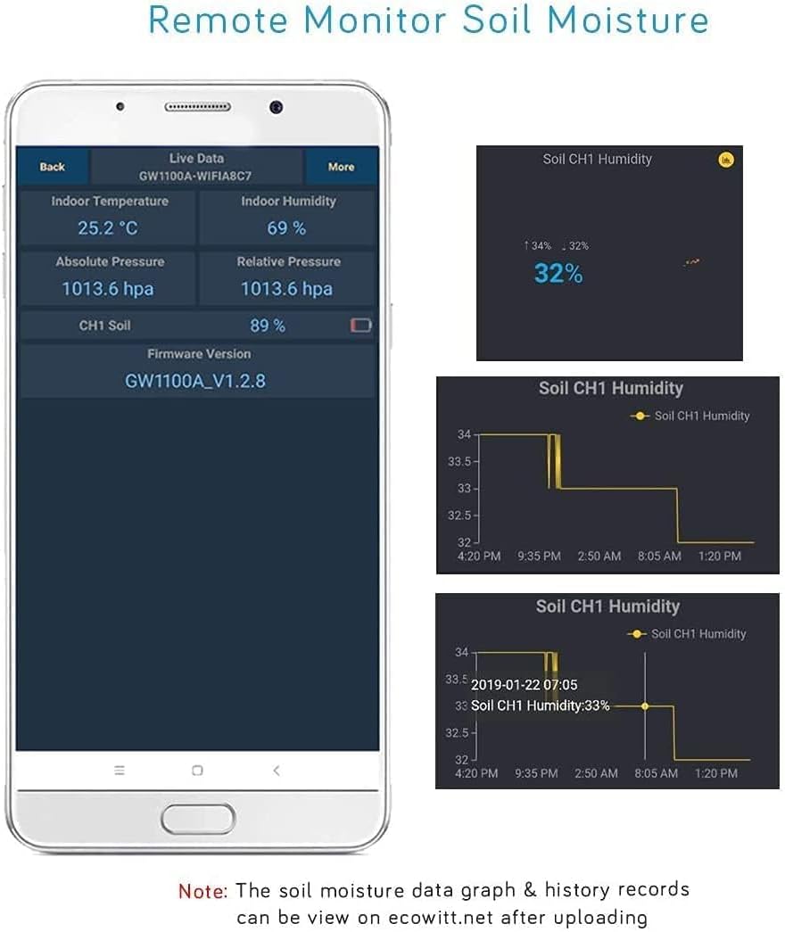 - 【Uploading to Ecowitt Weather Server】: Supports uploading to our free Ecowitt weather server(ecowitt.net) to view the soil moisture data graph and download the history records on the website; support setting and receiving email alerts from the server; channel names can be edited on the website; supports remote monitoring with smart phone, laptop, or computer by visiting the website.