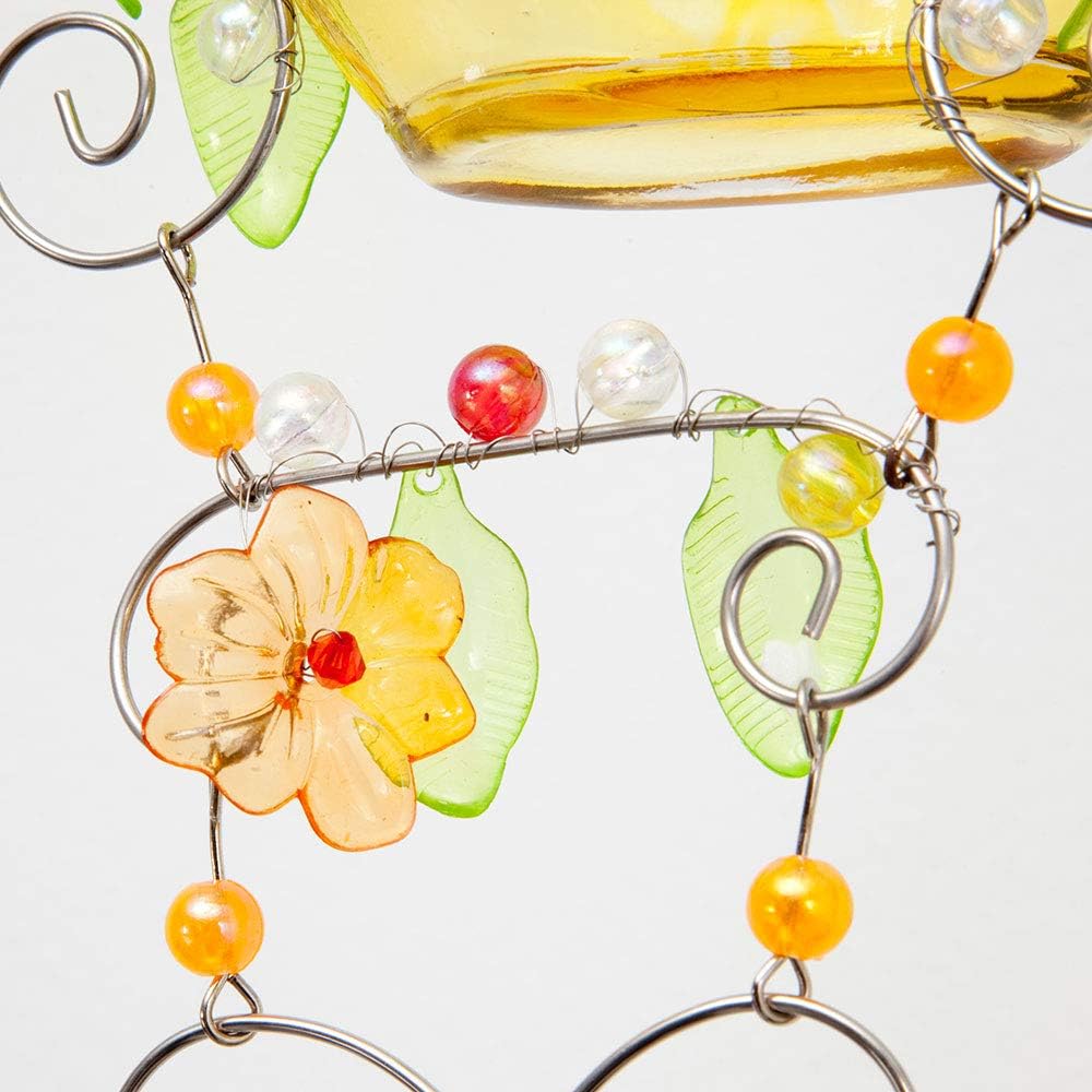 - Glass bottles are suspended by metal tendrils and decorated with bright acrylic beads, flowers and leaves.