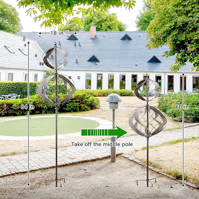 - Easy to Assemble: Assemble easily with the instructions and no additional wiring. Simply outdoor metal wind spinners, put it on a sunny location and enjoy your garden ornament. Perfect Size: Wide 18" & Height 84"