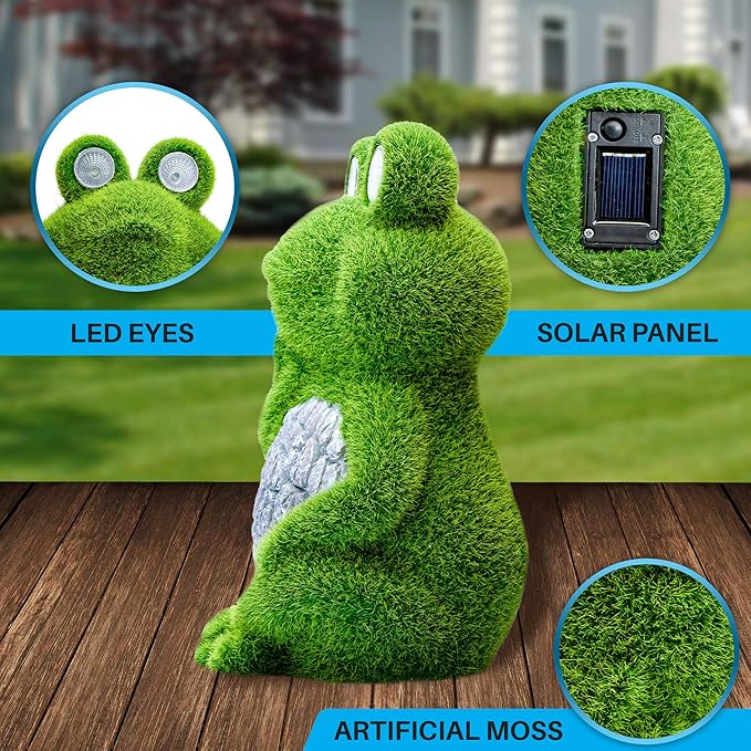 - Enjoy the whimsical charm of our solar frog statue, a delightful addition to your patio, balcony, yard, or lawn. These solar powered animals with eyes that light up create a serene ambiance.