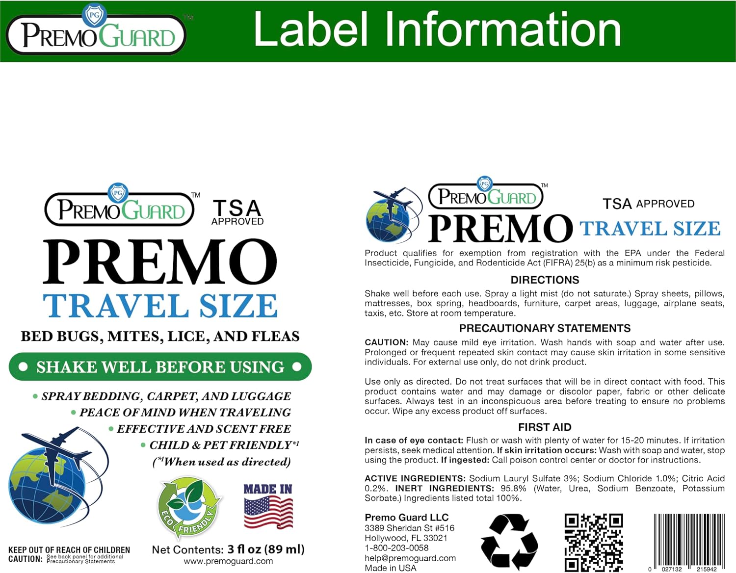 Travel Bed Bug & Mite Killer Spray by Premo Guard 3 oz – Child & Pet Safe – Fast Acting – Stain & Odor Free – Best Protection – Carryon Bag Approved