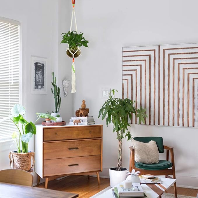 - SAVE SPACE - These 5 colorful macrame hanging plants hanger makes a wonderful gift for house warmings, weddings, and all occasions.Use for living room, garden, kitchen, window, balcony, deck, patio, Porch, hallway, high and low ceiling decoration to save on shelf space and can beautify any indoor / outdoor corner spaces.
