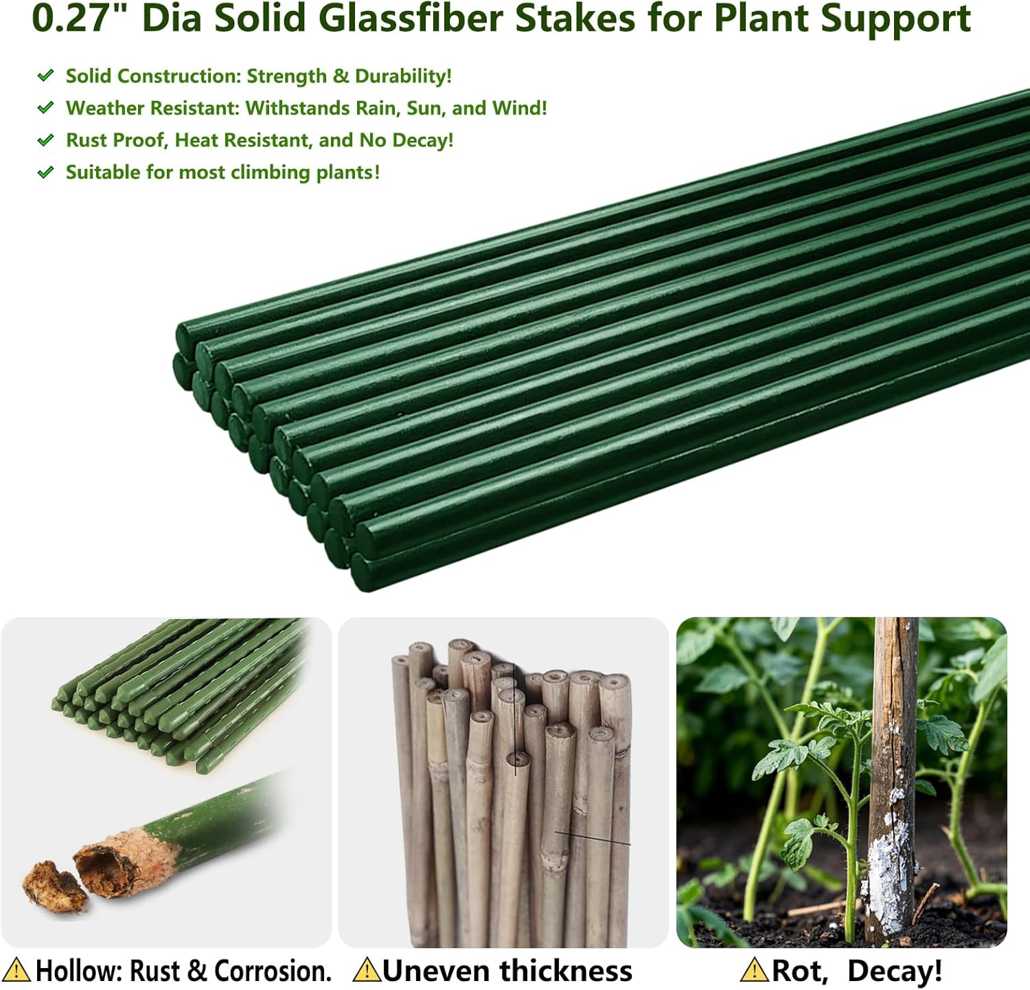 - Weather-Resistant & Rust-Free: Designed to withstand harsh outdoor conditions, these fiberglass rods are resistant to moisture, and corrosion, ensuring they remain reliable season after season.