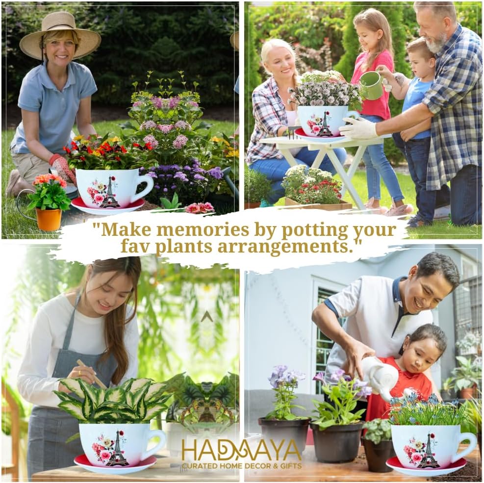 - DECORATIVE FLOWER POT: Elegant Red and white color teacup planter, French Parisian Eiffel tower red and pink floral motif cottage shabby chic aesthetic with drainage hole & saucer for home, garden decor, houseplants