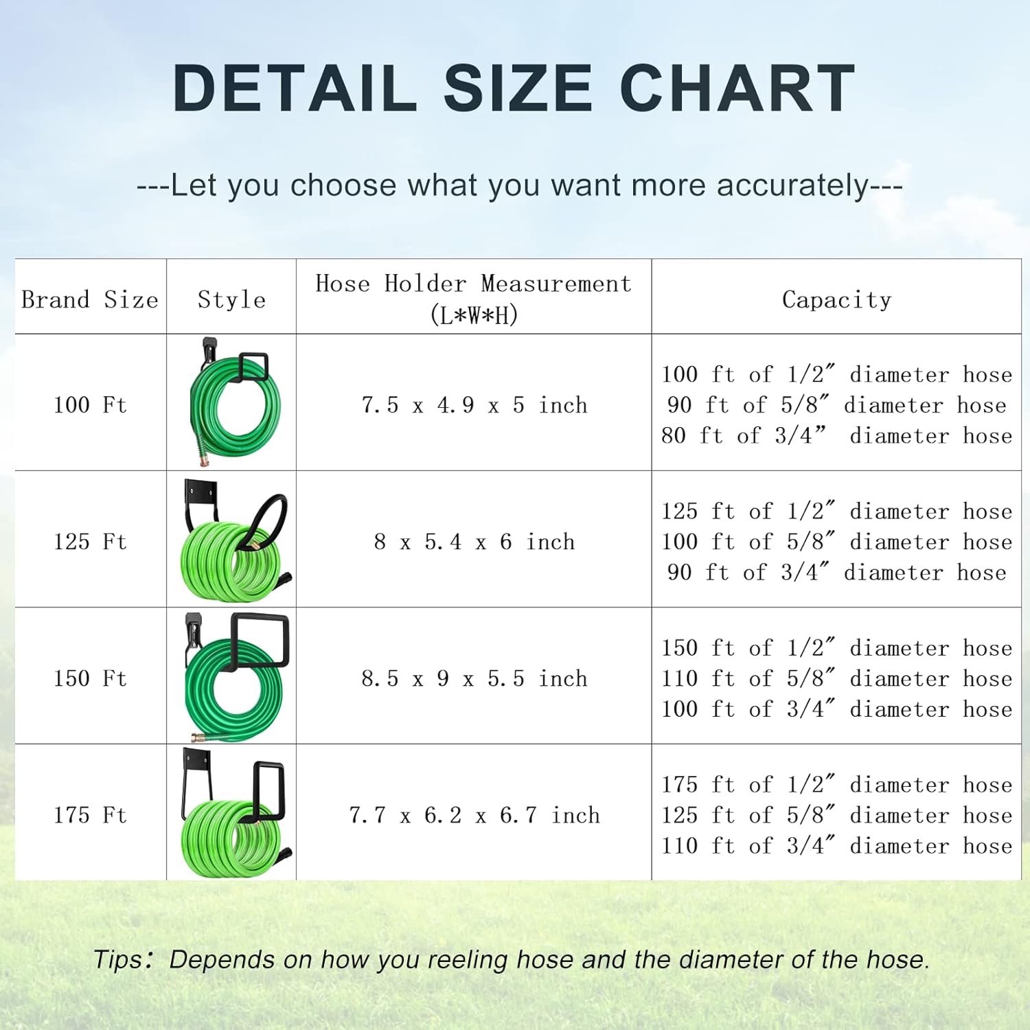 - ---Wide Application---Fit to any size hose, both 25ft 50ft 75ft 100ft and so on.Hold up to 100 ft of 1/2" diameter hose,90 ft of 5/8" diameter hose,80 ft of 3/4” diameter hose and more.