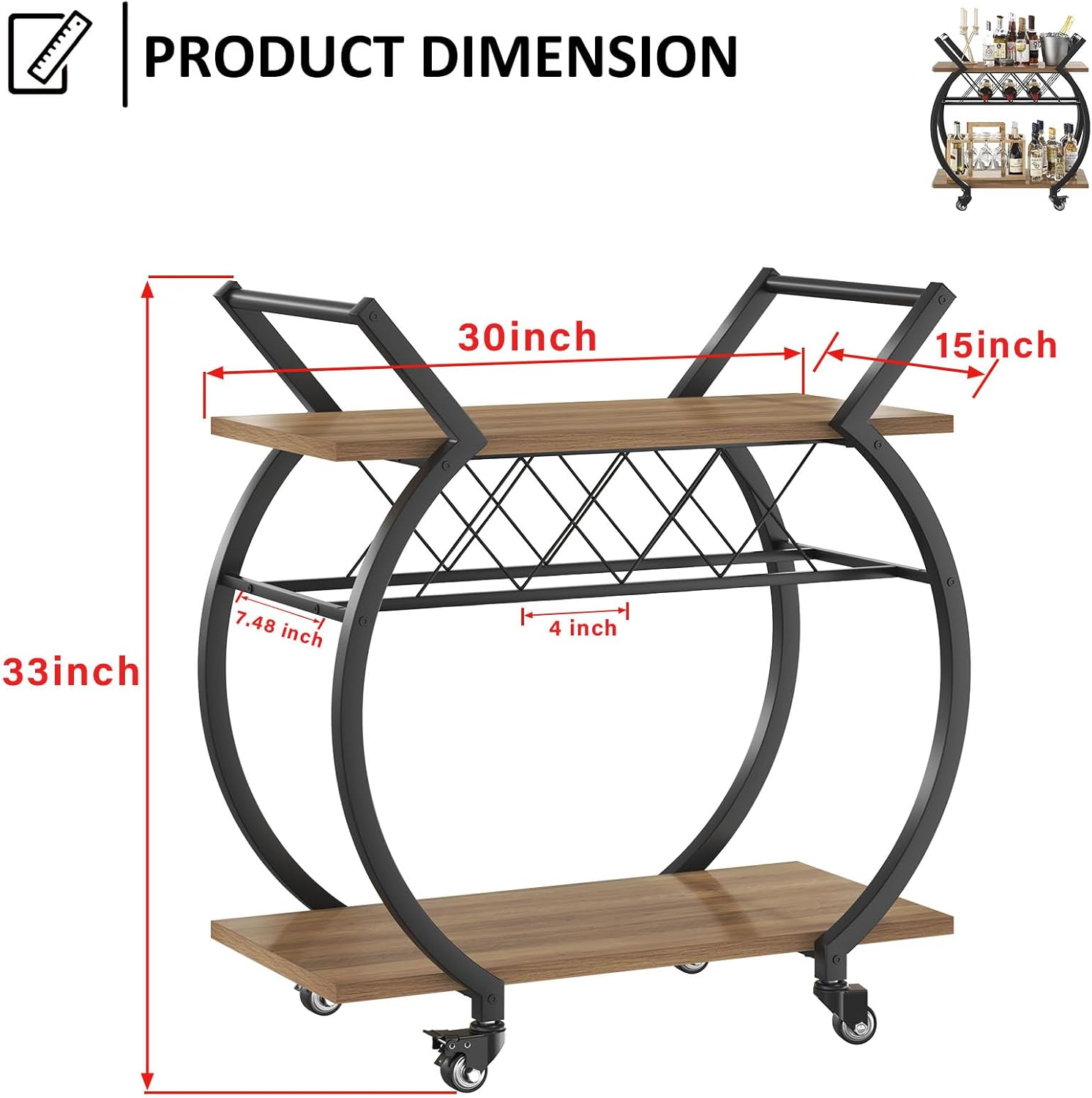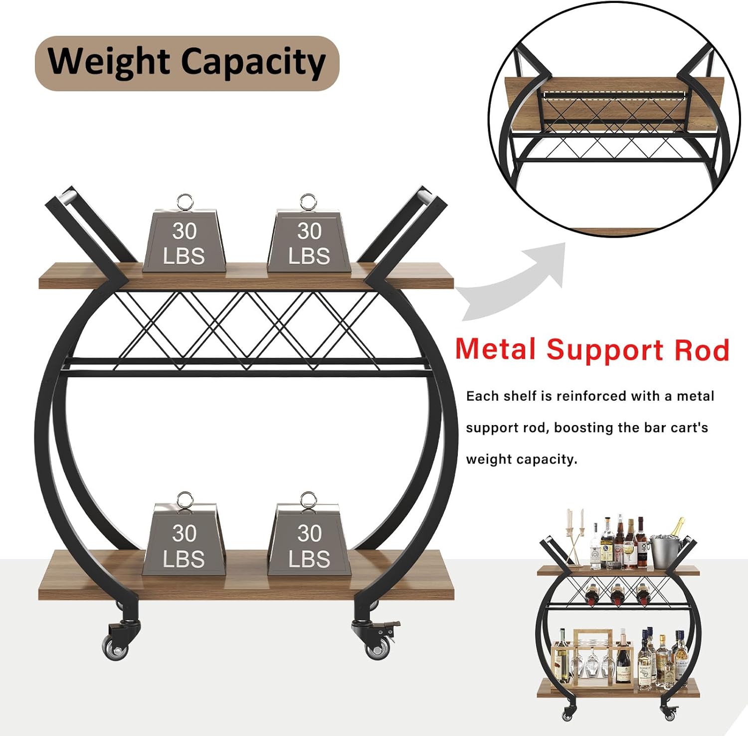 LVB Bar Cart with Wine Rack, 2 Tier Kitchen Cart on Wheels, Modern Wood and Metal Portable Coffee Cart Table for Home, Utility Industrial Mobile Serving Cart with Storage Shelf, Rustic Oak