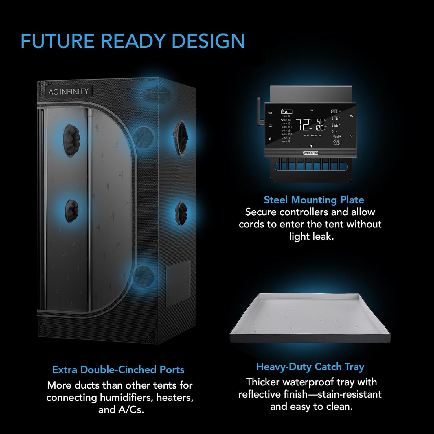 - Innovative controller mounting plate with lightproof cable passthrough and additional duct ports for humidifiers, heaters, and A/Cs.