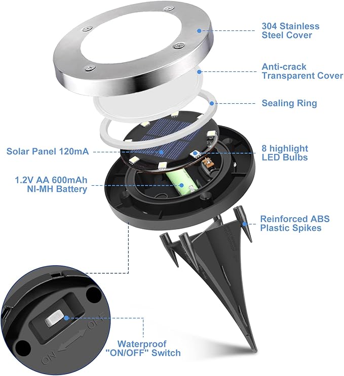 - WATERPROOF, SAFE AND DURABLE DESIGN - IP65 high level waterproof, 304 stainless steel cover with sealing ring and 4 screws fixed, upgraded anti-crack transparent lamp shade, reinforced ABS plastic spikes, all the modern materials make the solar disk lights are suitable for outside use in inclement weather, no need to worry about heavy rain, snow, frost, etc. As the disk lights are strong enough to withstand weight or more than 100kg, it's safe for children and pets to play on the grass