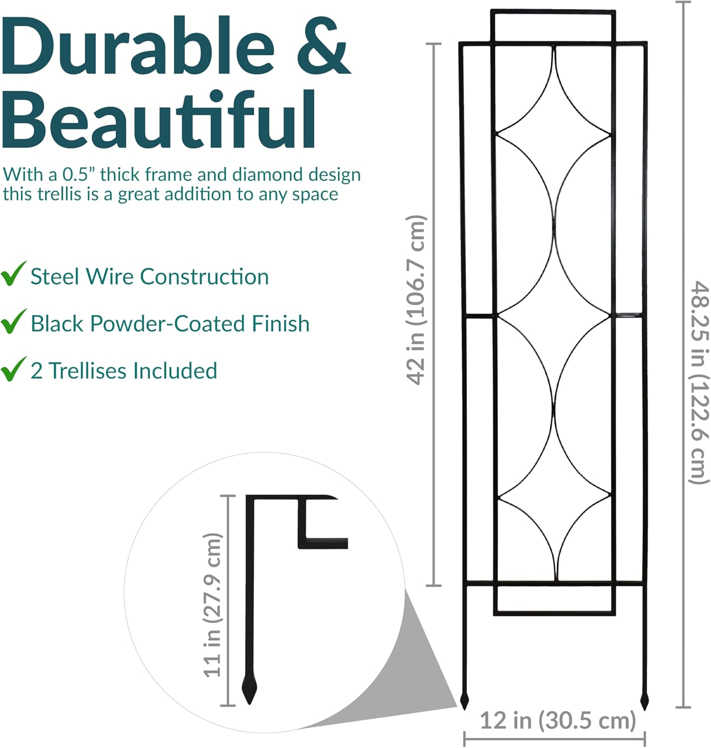 - GREAT SIZE FOR CLIMBING PLANTS: This outdoor trellis for climbing plants is great for a variety of plants, flowers, vegetables, and more. Each trellis measures 12" W x 48.25" H overall and weighs 3 lbs. The stake at the bottom measures 6.25" H, making the in-ground height of this trellis 42" H.