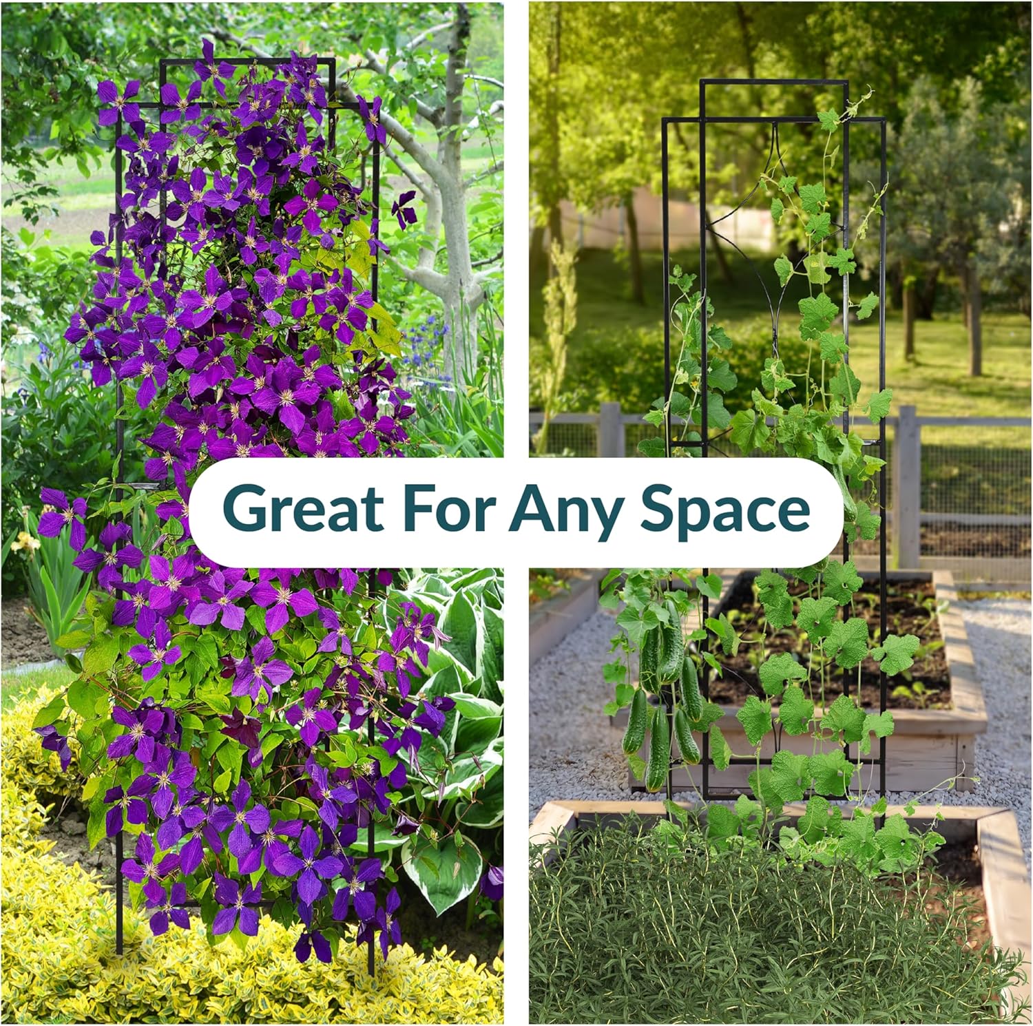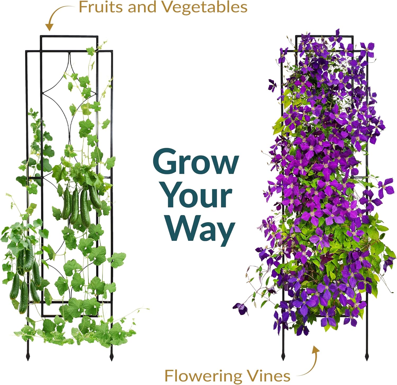 - PROMOTES HEALTHY PLANT GROWTH: This set of 2 diamond-styled metal garden trellises provides healthy climbing space for plant, vine, and rose growth, while also preventing plant, fruit, and vegetable breakage.
