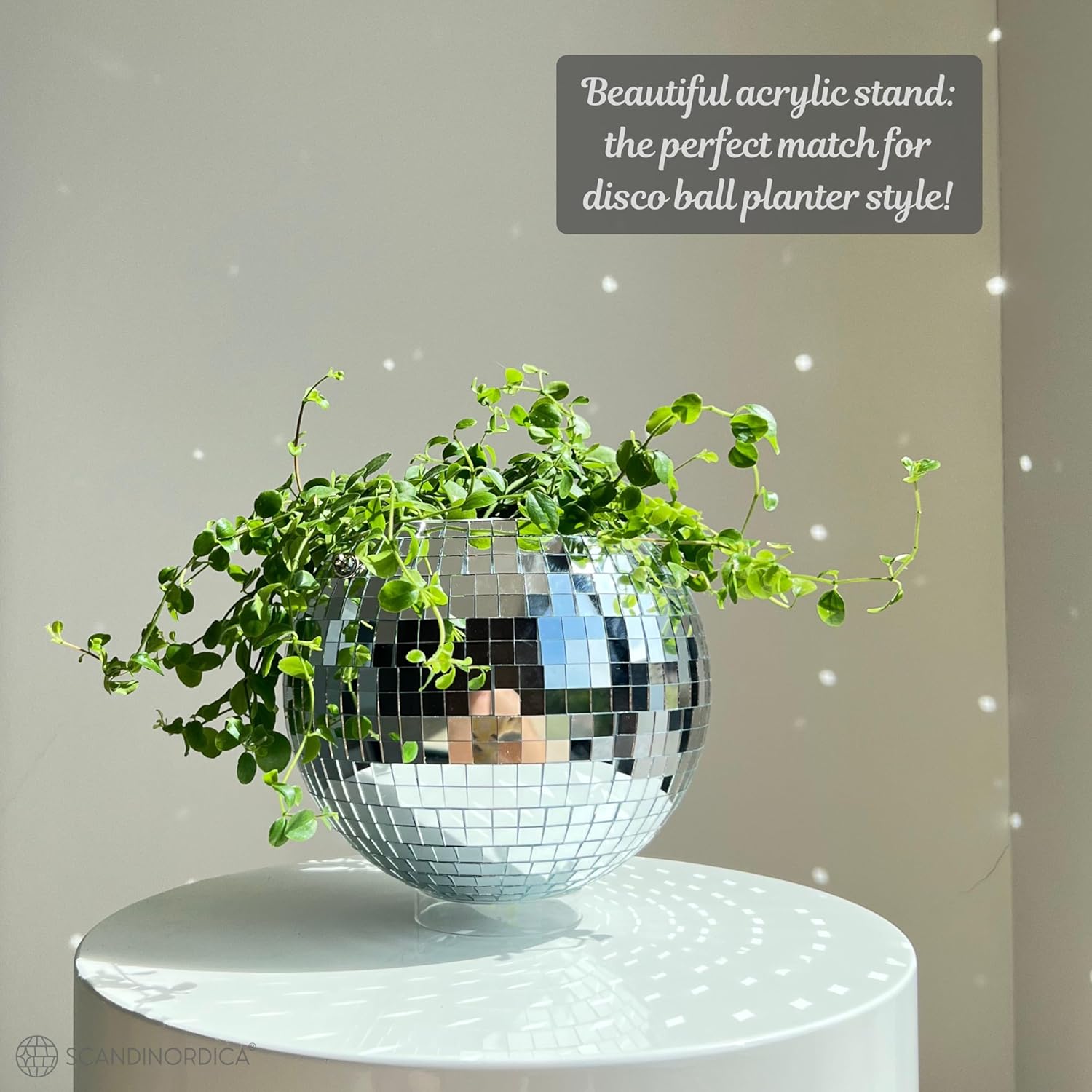 SCANDINORDICA Disco Ball Planter – Value Package: Disco Planter with Chain, Macrame Hanger and Acrylic Stand, Includes Self Watering Insert, Preppy Room Decor, Funky Decor | 8 inch Silver