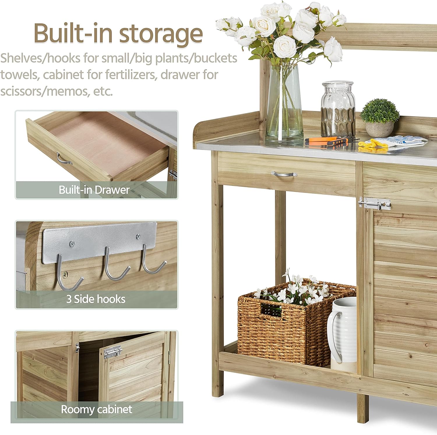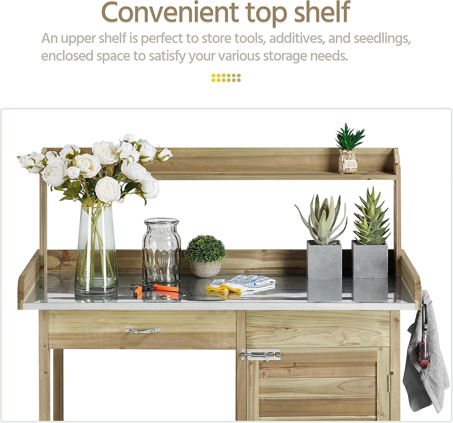 - THOUGHTFUL DETAILS, PLEASANT PLANTING: This outdoor bench for horticulture comes with 3 side hooks for hanging tools, fire pokes, or bags. The raised tabletop edges can prevent the items from falling down. The elevated shelf can house your planted flowers and unused tools without taking up your valuable operation space