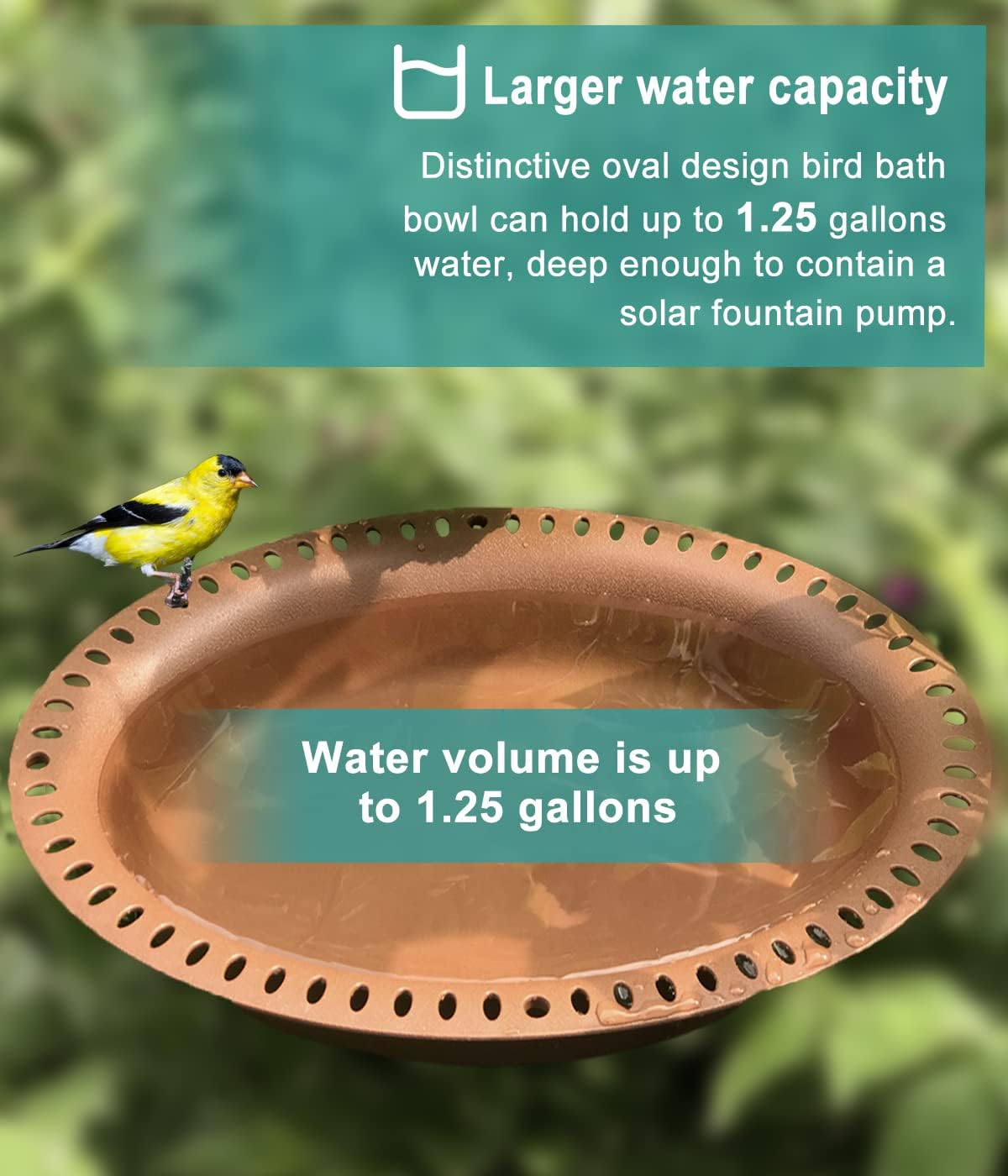 - More capacity & Oblong shape: This extra-large bird bath has an OBLONG tray with small holes along the edges, providing a stable standing and resting environment for the lovely bird friends. Bird friendly color--Chocolate color basin is gentle and unobtrusive in your outside areas, and deep enough for contain a solar fountain pump. (Bowl dimension: 17.2” L × 13.2” W, bowl depth: 2.76 inches.)