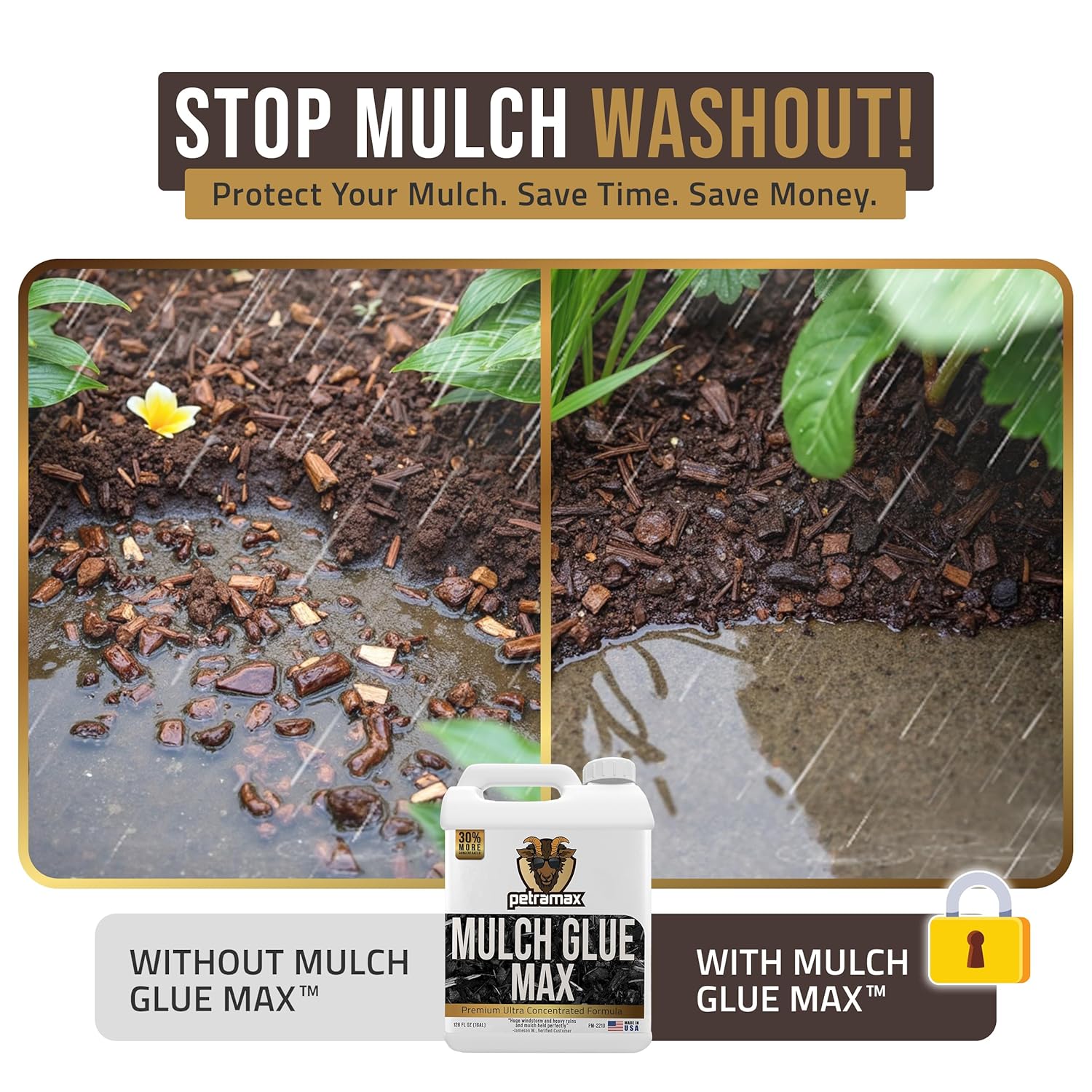 - SAY GOODBYE TO MESSY MULCH & PEBBLES FOREVER: Our Glue is the original landscape glue that powerfully holds garden mulch, wood chips, shells, sand, pine straw, small pebbles, hay and straw, small gravel, and leaf piles in place. No more mulch wash-outs on your sidewalk!