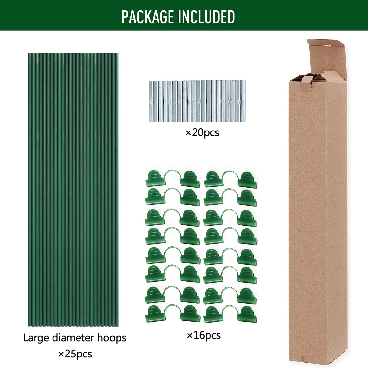 - 【DIY KIT】Includes 25 large-diameter hoops, each 17" long, 20 connectors, and 16 clips. You can combine 5 or more hoops to create your own grow tunnel. The clips can also be used to secure the greenhouse covering.