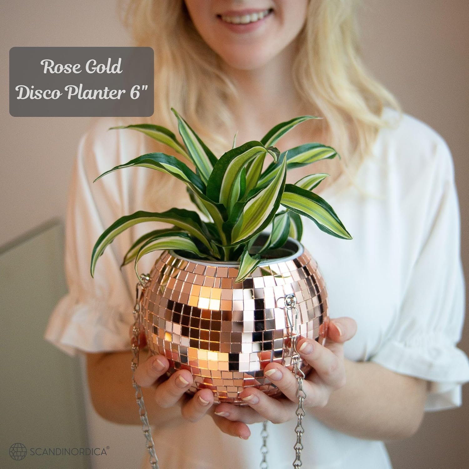 SCANDINORDICA Disco Ball Planter – Value Package: Mirror Disco Planter with Chain, Macrame Hanger and Acrylic Stand for Desk, Includes Self Watering Insert, Quirky Gifts | 6 inch Rose Gold