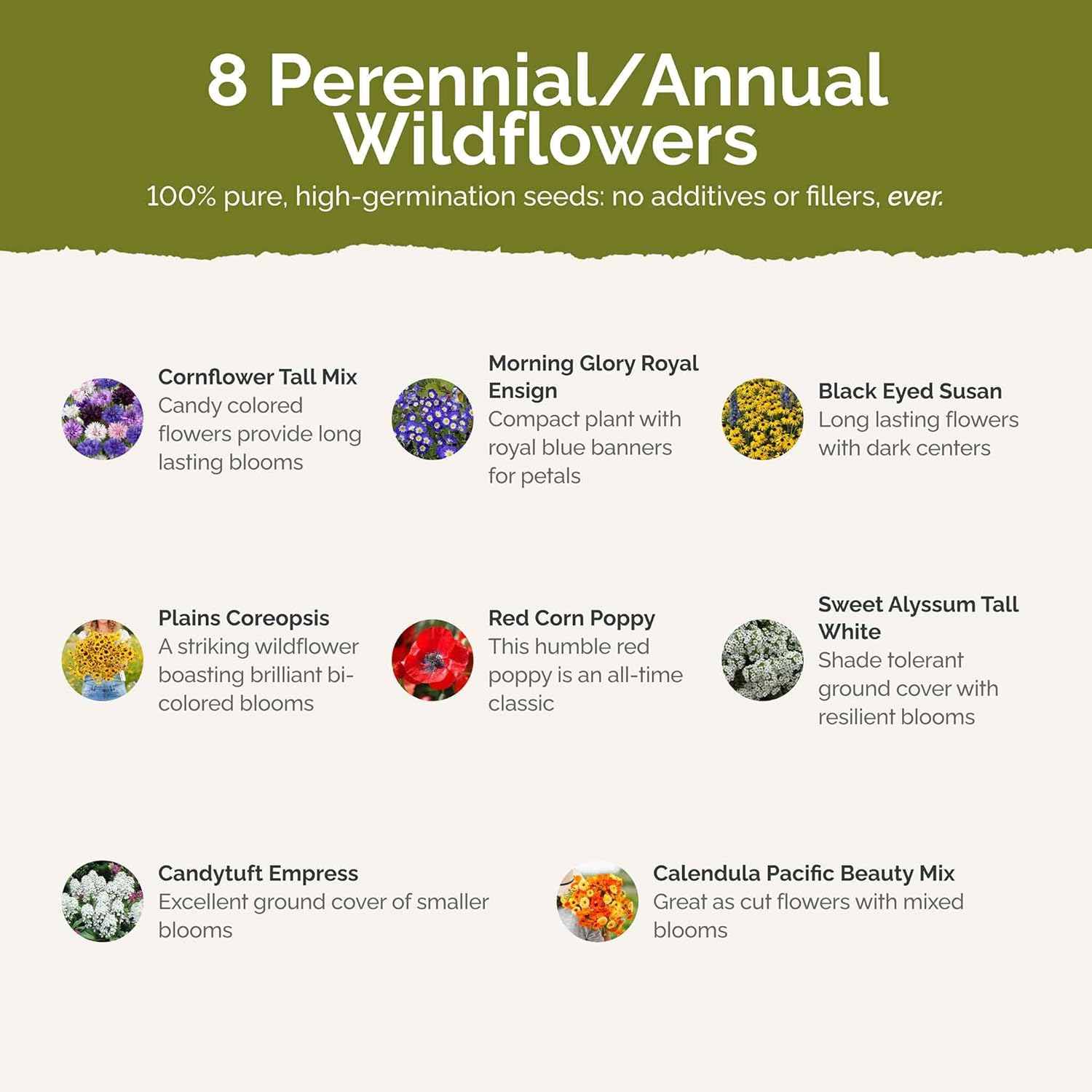 - 100% Pure, Non-GMO Seeds - No fillers, favorites only! Includes 8 easy-to-grow species: Cornflower Mix, Morning Glory Mix, Black Eyed Susan Mix, Coreopsis Mix, Sweet Alyssum, Candytuft