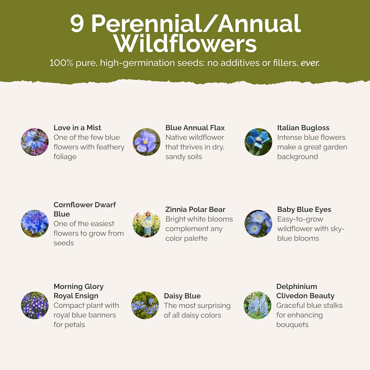 - 100% Pure, Non-GMO Seeds - No fillers, favorites only! Includes 9 easy-to-grow species: Love in a Mist, Annual Blue Phlox, California Bluebell, Cornflower Blue, Zinnia Polar Bear, Baby Blue Eyes, Chicory, Delphinium Blue Bell, Morning Glory Blue Ensign