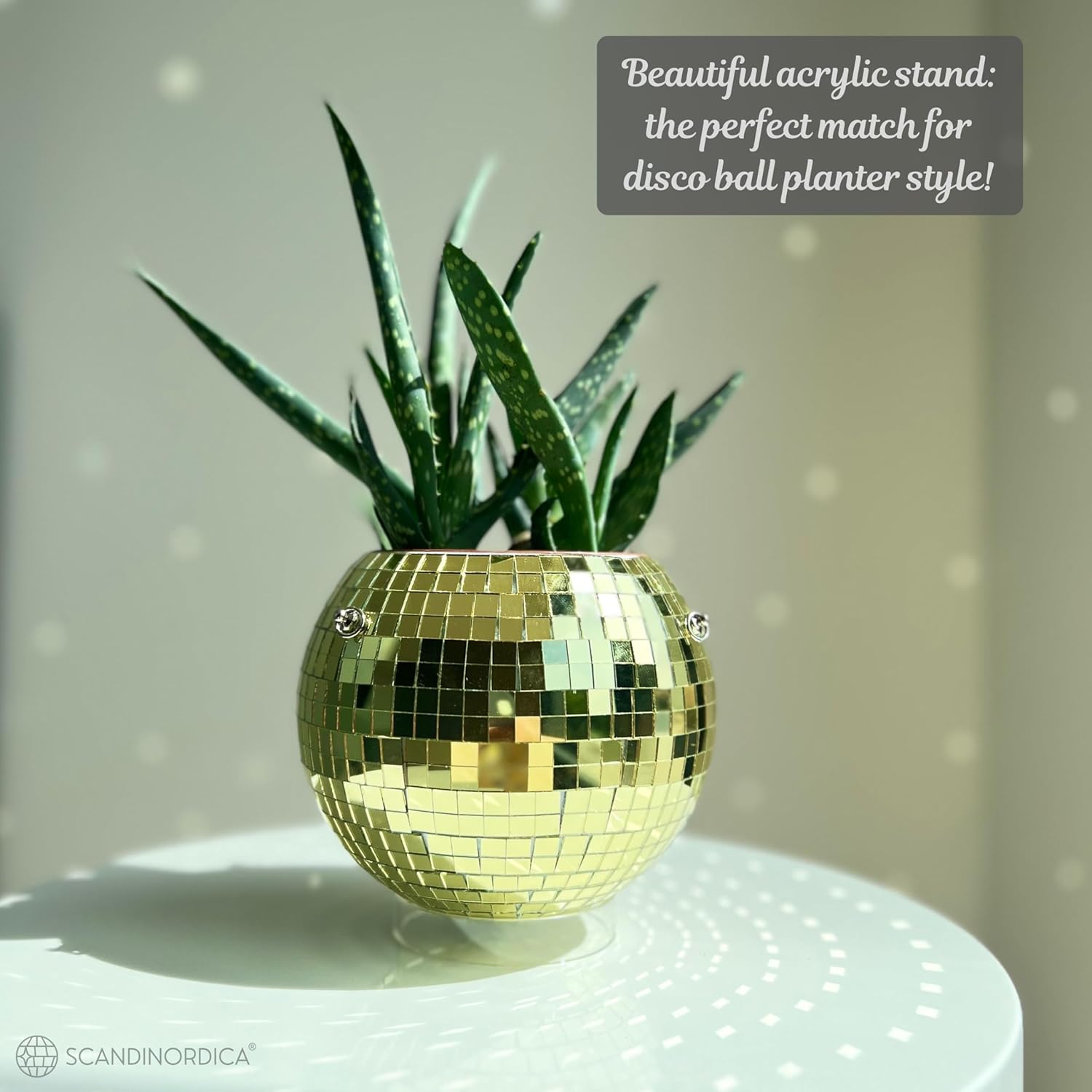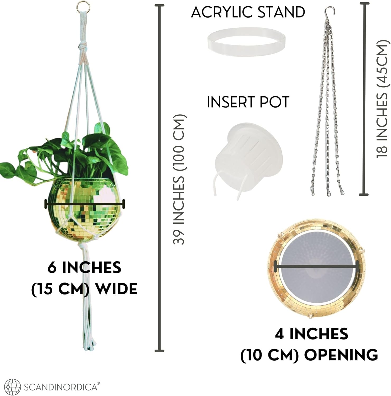 SCANDINORDICA Disco Ball Planter – Value Package: Mirror Disco Planter with Chain, Macrame Hanger and Acrylic Stand for Desk, Includes Self Watering Insert, Retro Decor | 6 inch Gold