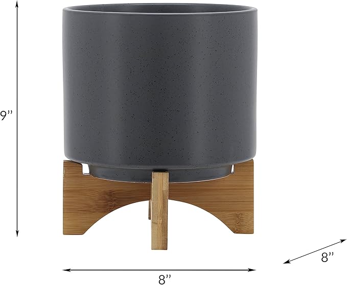 Sagebook Home 8" Ceramic Planter, Matte Gray Planter, Indoor/Outdoor Planter on Wooden Stand - Use for Succulent Pot, Plants, Flowers and More