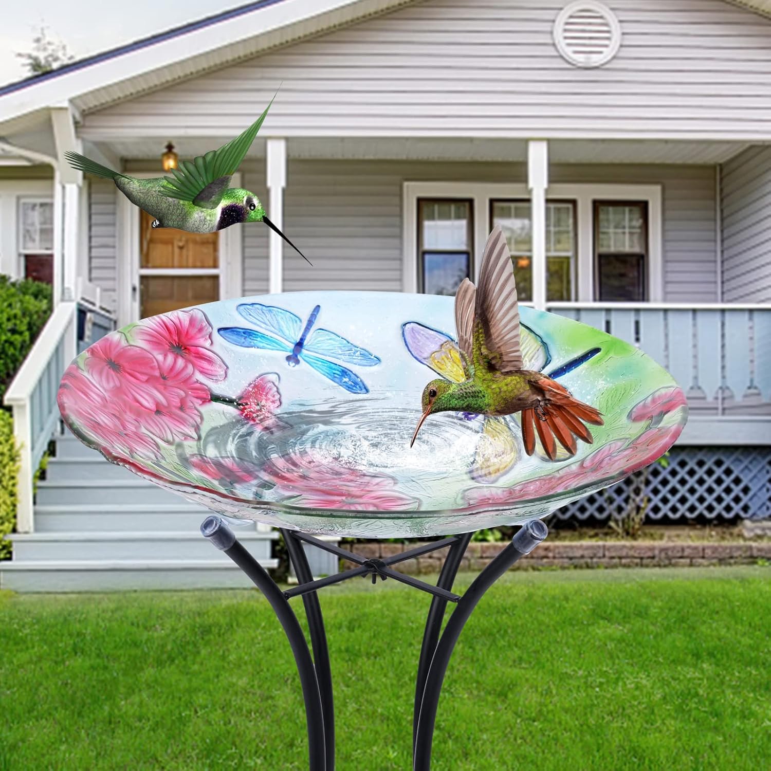 MUMTOP Bird Bath-Bird Baths for Outdoors - Dragonfly Large Bird Bath Bowl with Metal Stand, Glass BirdBaths for The Garden Lawn Yard Decor