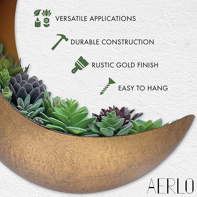 Wall Mounted Metal Moon Planter - Hanging Crescent Pot for Succulents, Air Plants, Cacti - Boho Indoor Outdoor Moon Wall Decor for Bedroom, Bathroom, Living Room, Nursery - Rustic Gold