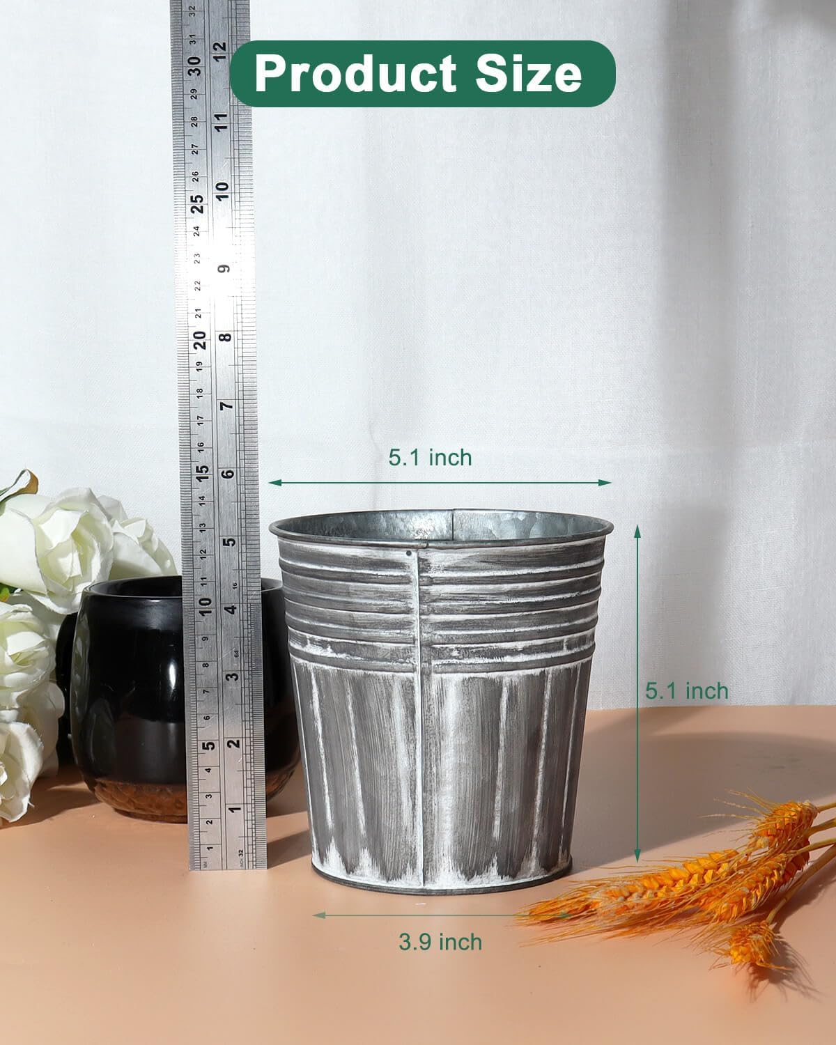 - 【Size of Metal Flower Pots】There are 6pcs metal planters in a package. The topper opening diameter 5.1 inches, the bottom diameter 3.9 inches, and the barrel height is 5.1 inches. These tin buckets have ample space for plant growth, making them ideal for succulents, herbs, and flowers, keeping your greenery vibrant.