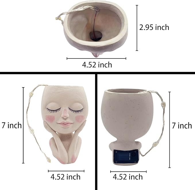 - đŒăUnique DesignăSolar unique face planters maked with drainage holeïŒWith 30 LED lights for DIY various shapes.Product length is 4.5 inches. The width is 3.5 inches. Solar light string in the flowerpot is protected by a casing, which is moisture-proof, sun-proof and IP65 waterproof, suitable for various planting. can withstand different weather conditions.