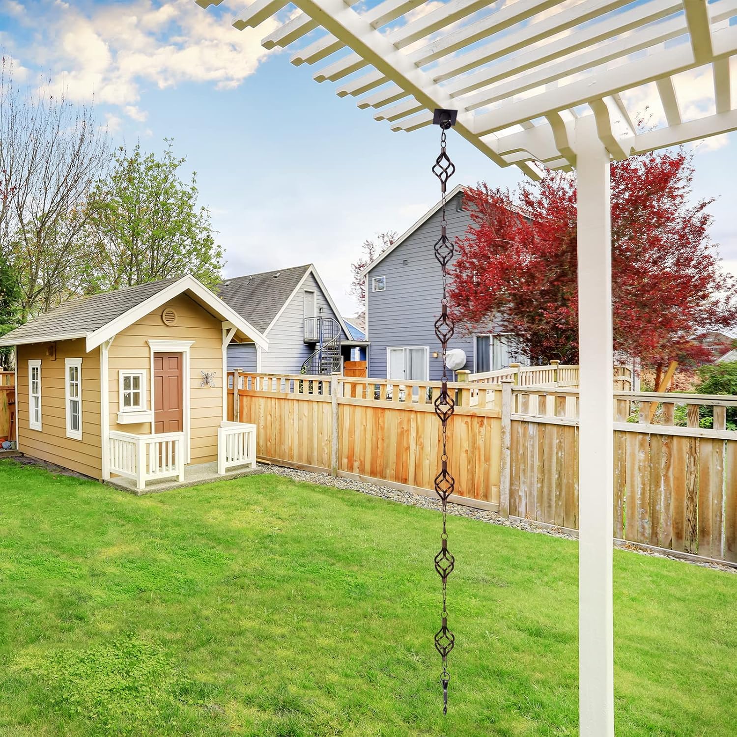- Fashionable Birdcage Shape Rain Chain Design: Decorate your garden with rain chains for gutters, more than an art of garden. The rain chains for gutters has combined both its functions and appearance, from which the superior copper and iron garden rain collector guarantees the outstanding durability, and the accurate cumulative radius of rain chain in the sewage pipe.