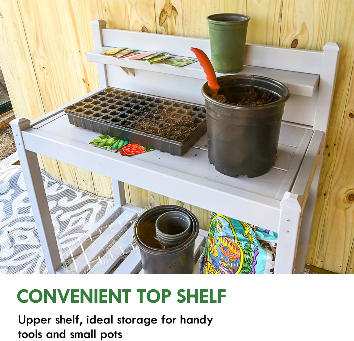 - LARGE STORAGE SPACE: The garden potting bench is crafted with an open top shelf and lower bottom storage shelf. Easily keep your gardening tools, flower pots, and additional supplies organized. Weight capacity of the lower shelt is 77 lbs.