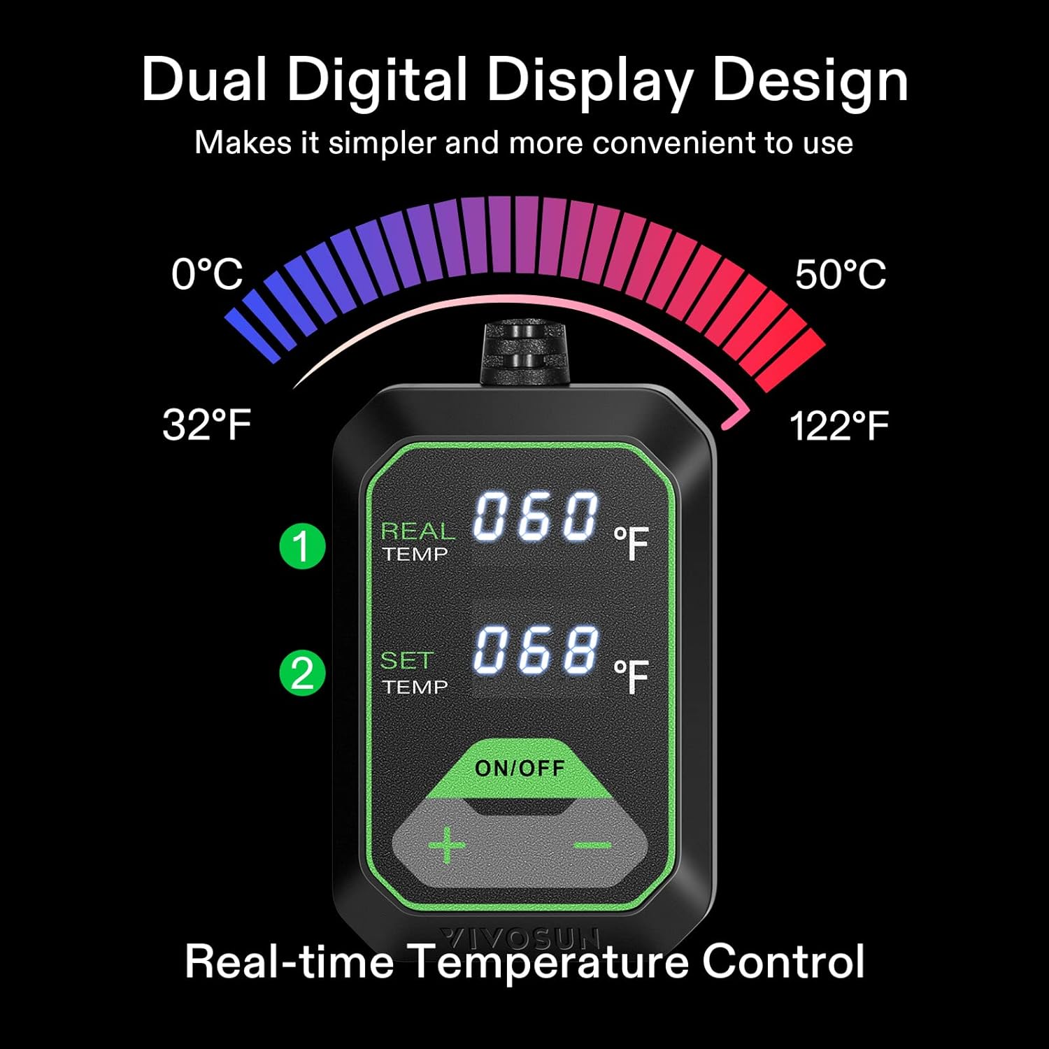 - Heat Mat Feature 2: This thermostat comes with a adjustment function allows users to set the desired temperature according to the needs of their plants—it's simple and convenient to use; It also receives data from the internal sensor chip and displays the temperature of the heating pad in real-time