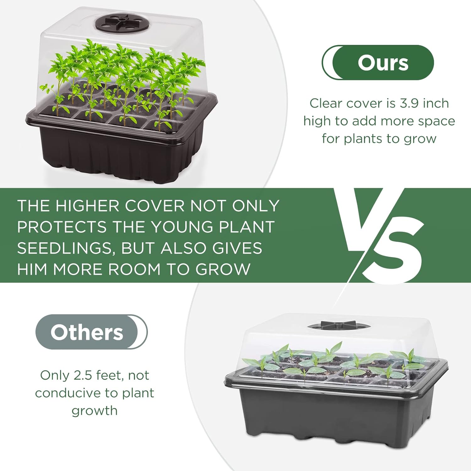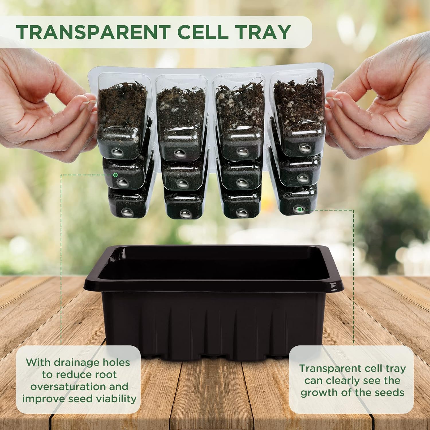 - PERFECT FOR SEEDS GROWTH:Each tray “pack” features a solid base, a 12-cell insert, and a clear plastic humidity dome. The cells taper from wider on top to smaller at the bottom to make seedling removal easier. The clear plastic trays of this seed starter make it easier to observe your plants without having to pull seedlings from the tray. Drainage holes at the bottom of seedling starter trays also help maintain a better soil moisture level, so more seeds germinate.