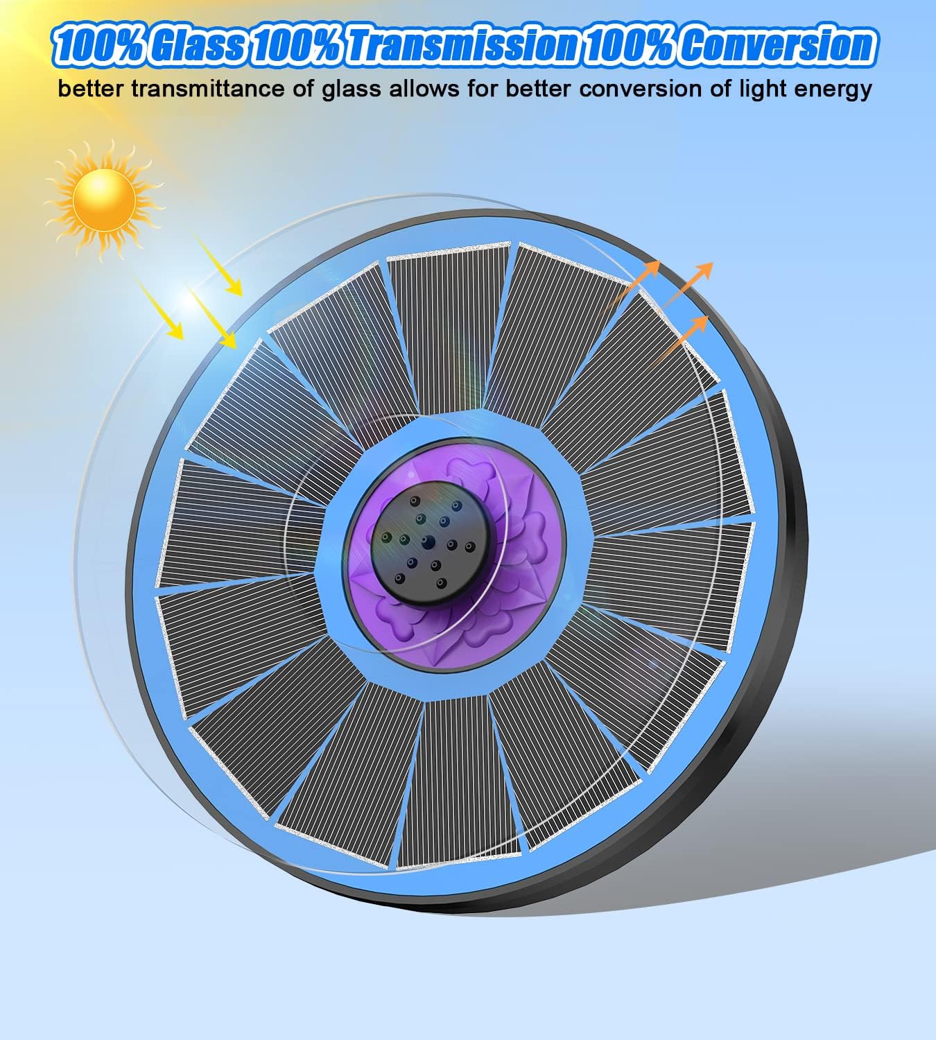 - High-end Glass Manufacturing Process: The solar water fountain uses new anti-corrosion glass materials to ensure that if it's for a long time in harsh environments, it will not oxidize and turn white. The glass surface gives the fountain a very high-end look and a good texture, and the purple pattern in the center looks like a flower bud. It will undoubtedly be the most beautiful fountain pump you have ever seen, adding a view and fun to your garden