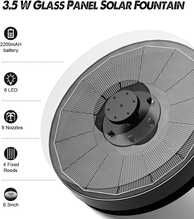 - Colorful LED Lights Solar Fountain: 3.5W solar water fountain for birdbath is equipped with 6 LEDs; The RGB colorful led light will auto light up at night; With 2200 capacity battery, the solar fountain with battery fully charge will provide power for about 3 - 4 hours working at night; During the day, the solar water fountain will attract all kinds of birds, like hummingbirds; At night, you and your family can enjoy the wonderful light show; Go and buy our amazing solar fountain with colorful light to decorate your Garden