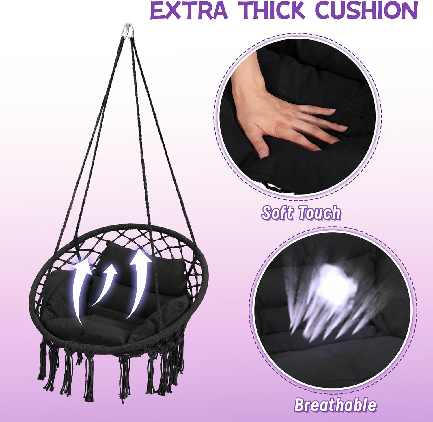 Macrame Hammock Hanging Swinging Chair with Medium Cushion, Perfect for Bedroom, Porch, Adults, Balcony, Black