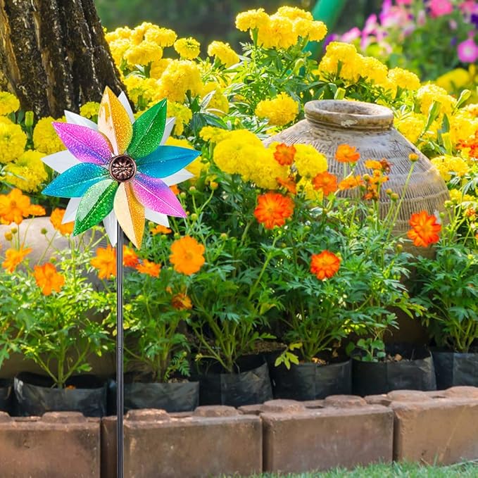 - [High Quality] Garden wind spinner is made of rustproof and waterproof metal and the colorful blades are coated with an anti-fading coating. Metal garden pinwheel spins when driven by the breeze to create a dynamic spinning effect.