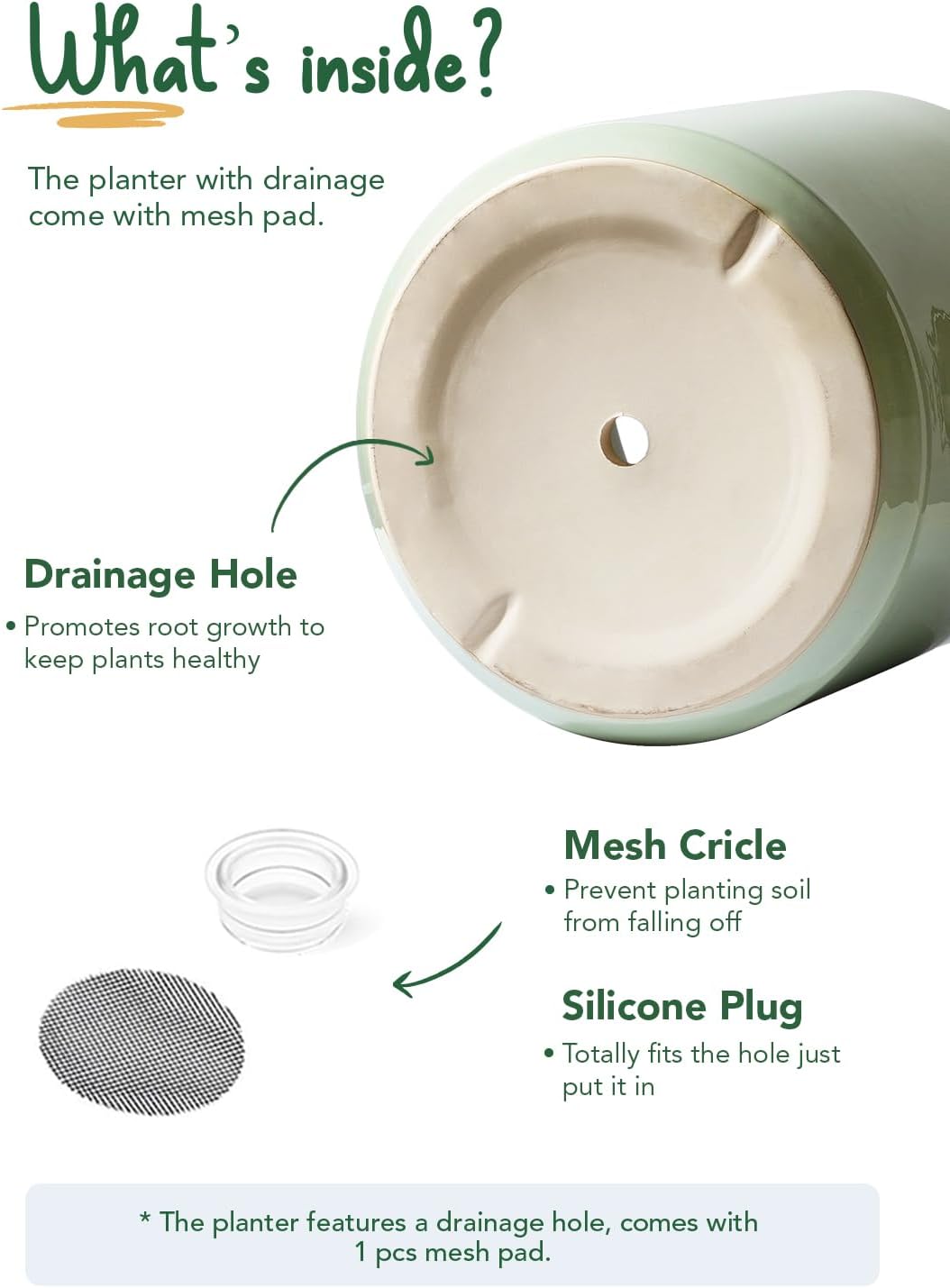 - Silicon Plug, Drainage Hole, Net Included: To drain or not to drain, it's all up to you; Roots love moisture but are afraid of excessive water; Use a silicon plug to prevent water leakage, or cover the drainage hole with a mesh pad to prevent soil loss, offering good ventilation for plants to breathe freely (Plant is Not Included)