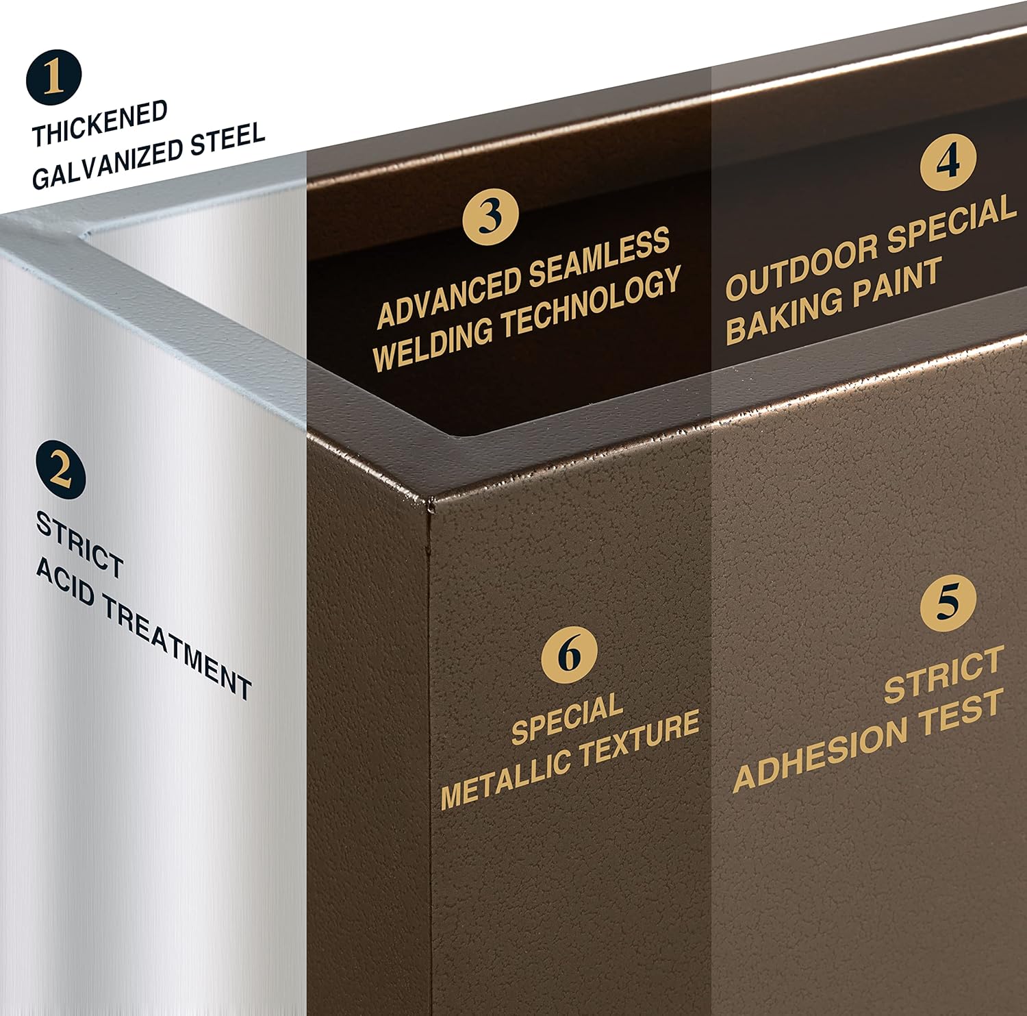 - 【No Assemble and Seamless】Our flower box arrives fully assembled and requires no additional setup. Simply unpack and place it in your desired location for instant use, saving you time and effort. Crafted using advanced fully automatic welding technology, this flower box features a seamless, one-piece design with a smooth and even surface, ensuring long-lasting durability and a polished appearance.