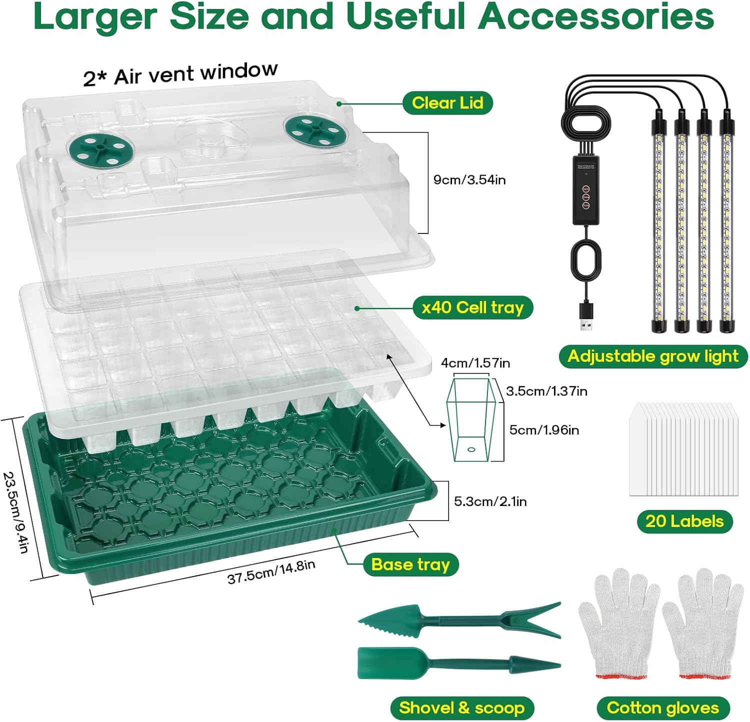 - 【360°Spectrum Seed Starter Tray With Grow Light】 Larger grow light cover spectrum for better seedling grow, the seed started kits have 4 full spectrum strip seed grow lights insert on the Dome of the garden plant starter kit. Now you can adjust and timed the light as you need! Withe& blue Light will help seedling growing faster and better. You can use this product by USB port or just plug-in,3 lighting modes & 3 timing functions (3H/6H/12H) & 5 brightness modes, the best tool for your garden